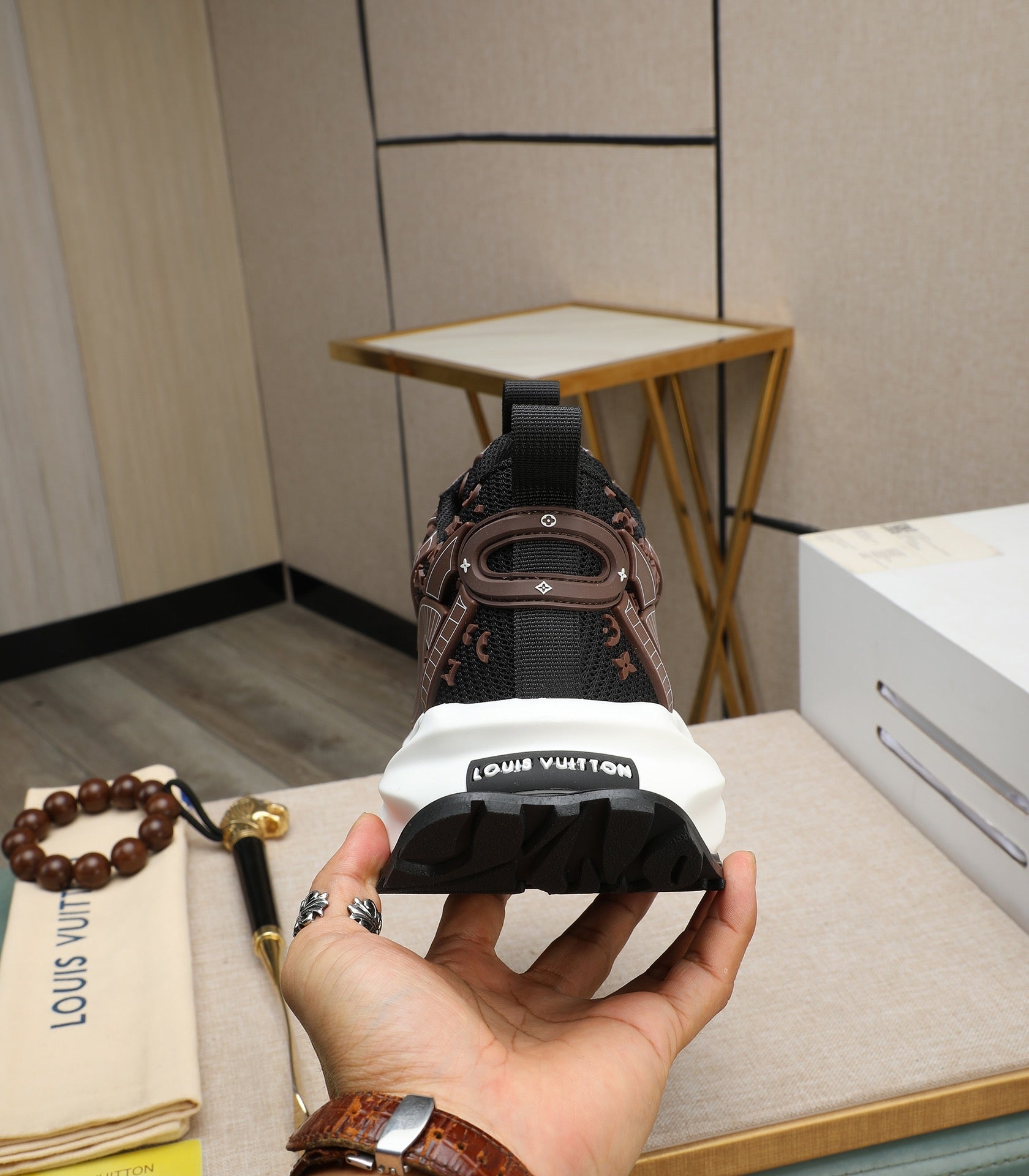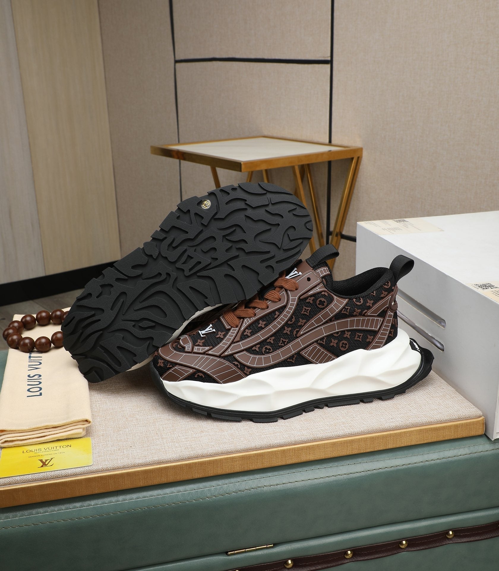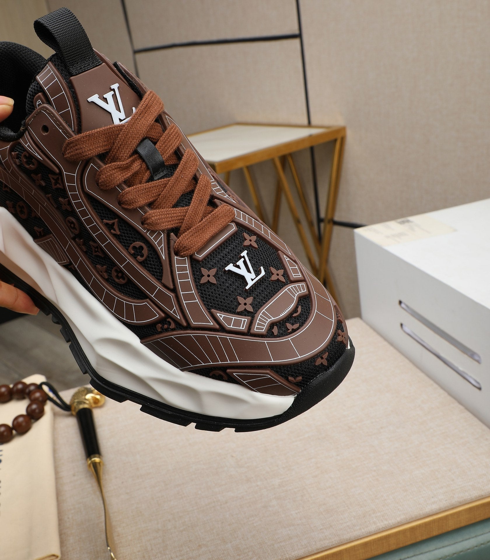 LV TRAINER IN CHOCOLATE BROWN CALFSKIN AND BREATHABLE MESH