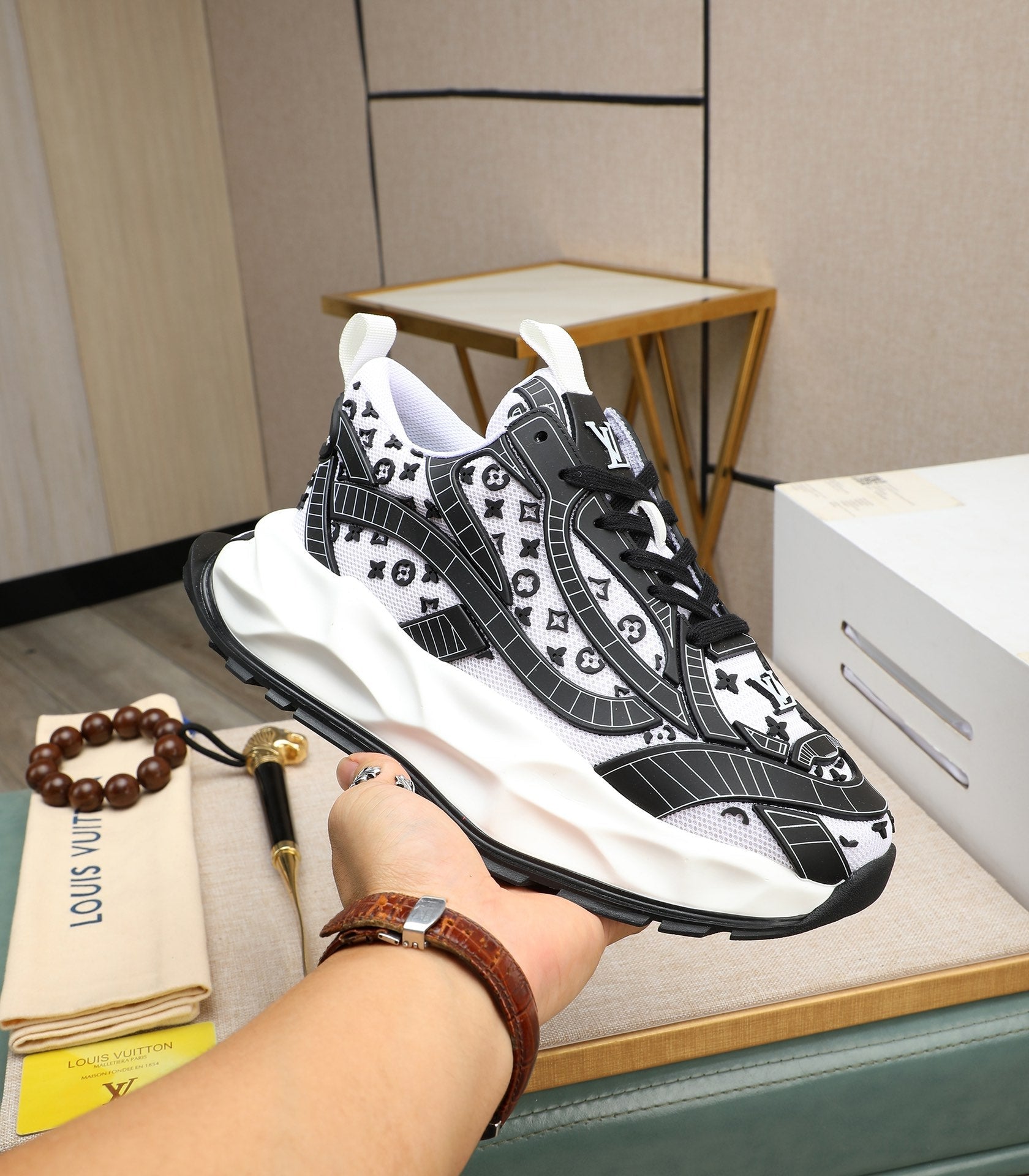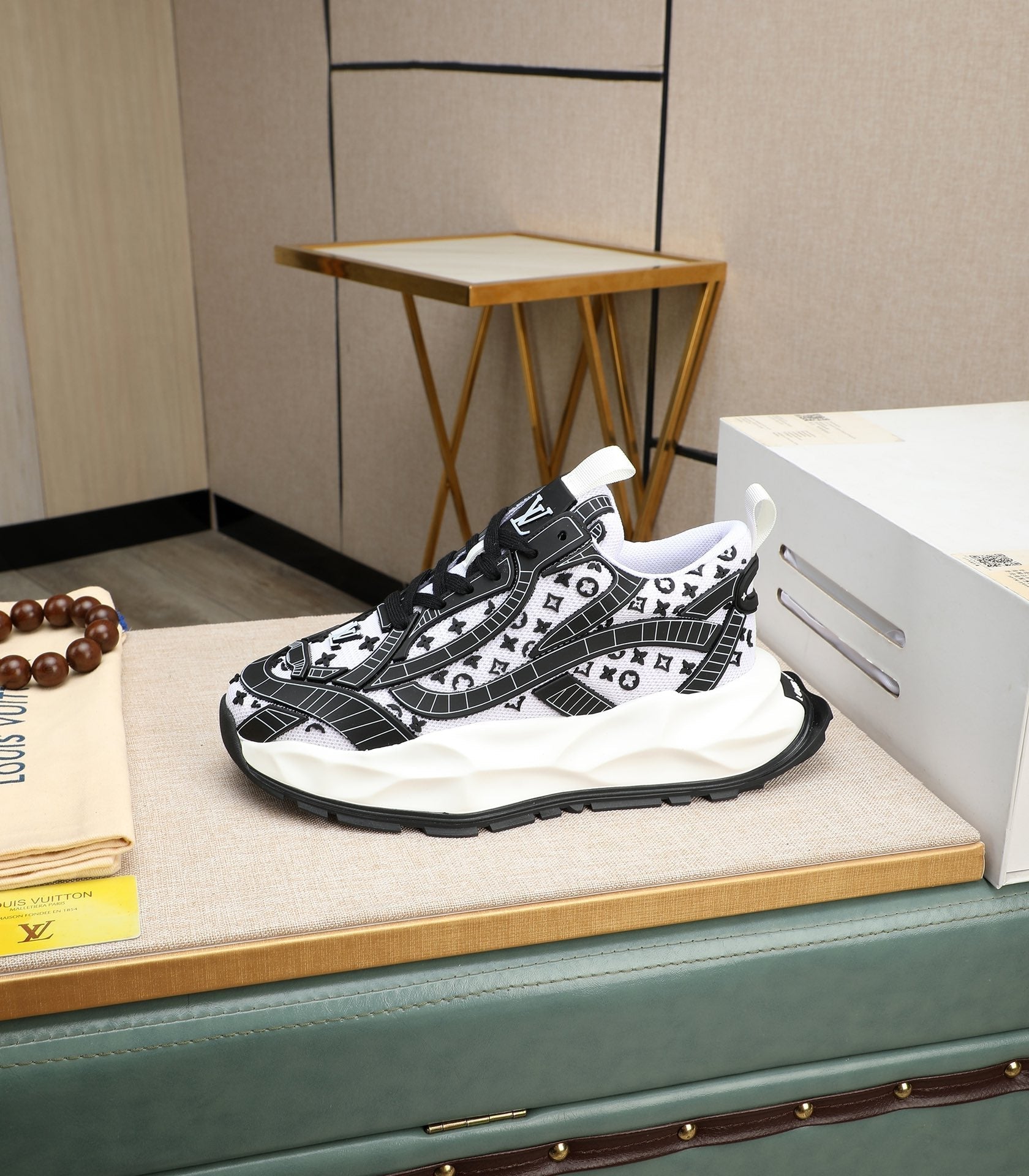 LV TRAINER WHITE MIX BLACK CALFSKIN AND BREATHABLE MESH