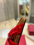 FUSSFRIEND CHERRY RED SILK VELVET SLIDE SANDALS