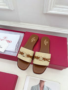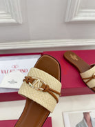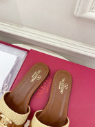 GARAVANI V LOGO SIGNATURE SLIDE IN BEIGE RAFFIA AND BROWN CALFSKIN