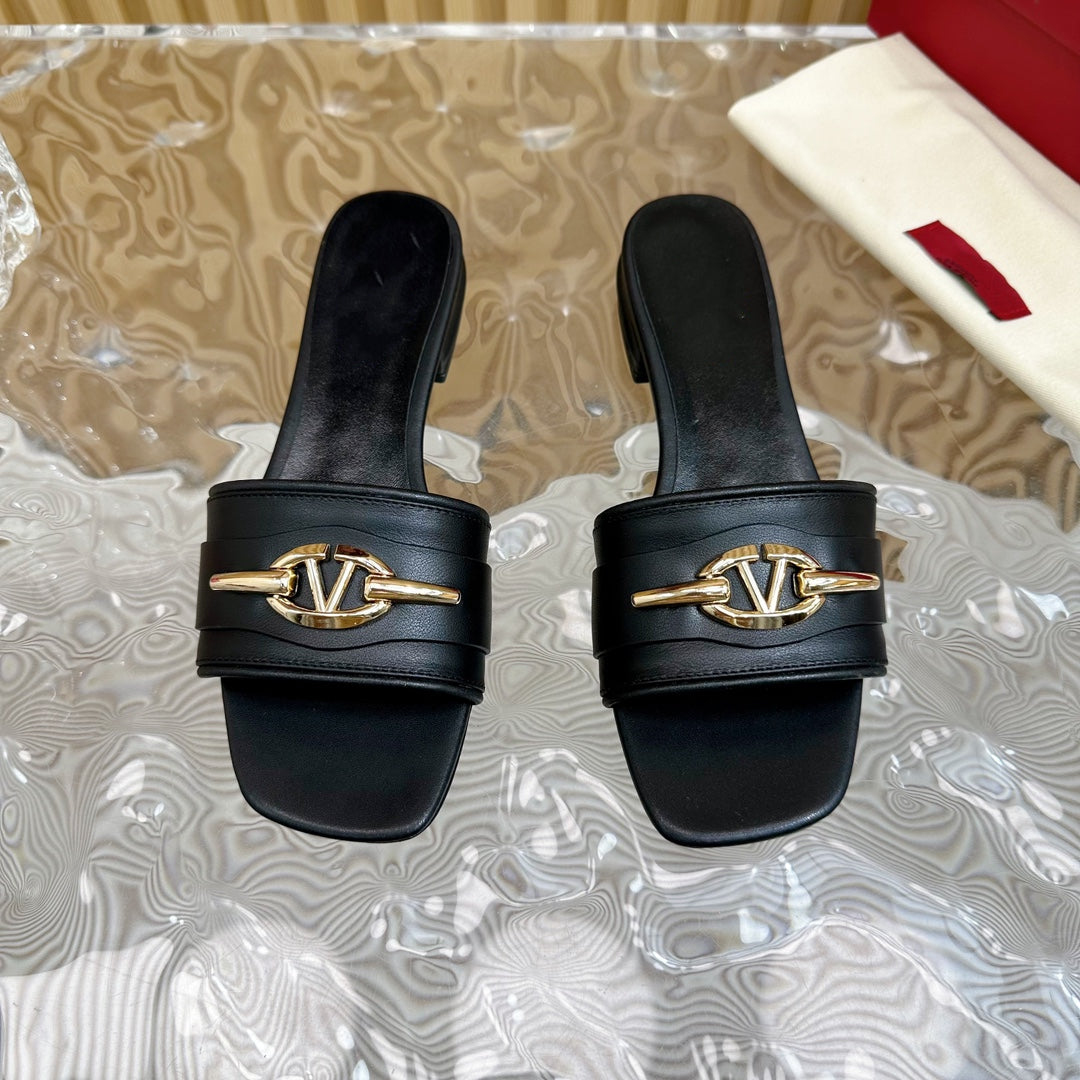 Vlogo Cut-Out Black Calfskin Slide Sandal