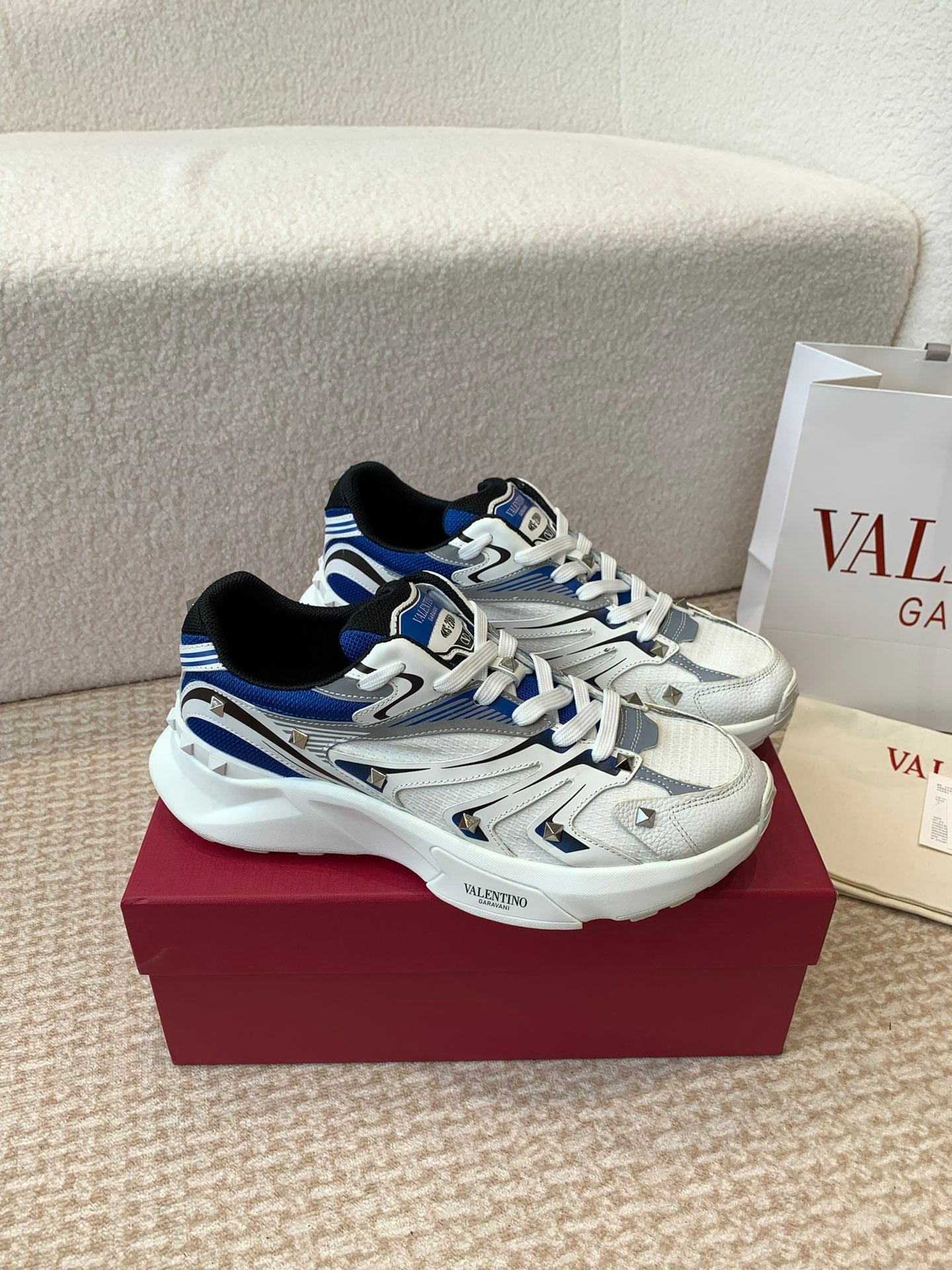 Valentino Sneaker 50mm In White Mix Grey Blue Mesh Fabric And Cowhide 814278
