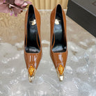 ORANGE GEM-STUDDED HIGH PUMPS IN BRONZE BROWN PATENT CALFSKIN