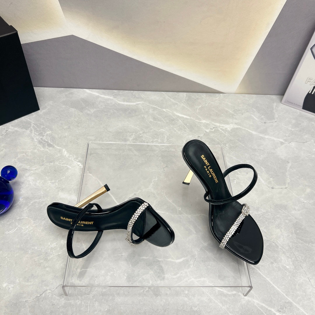 SL CRYSTAL THIN BELT HIGH HEELS BLACK SATIN