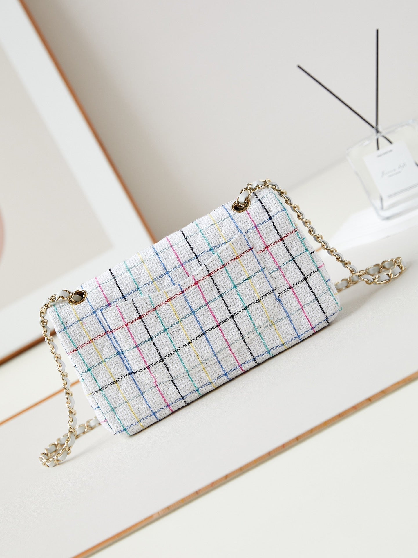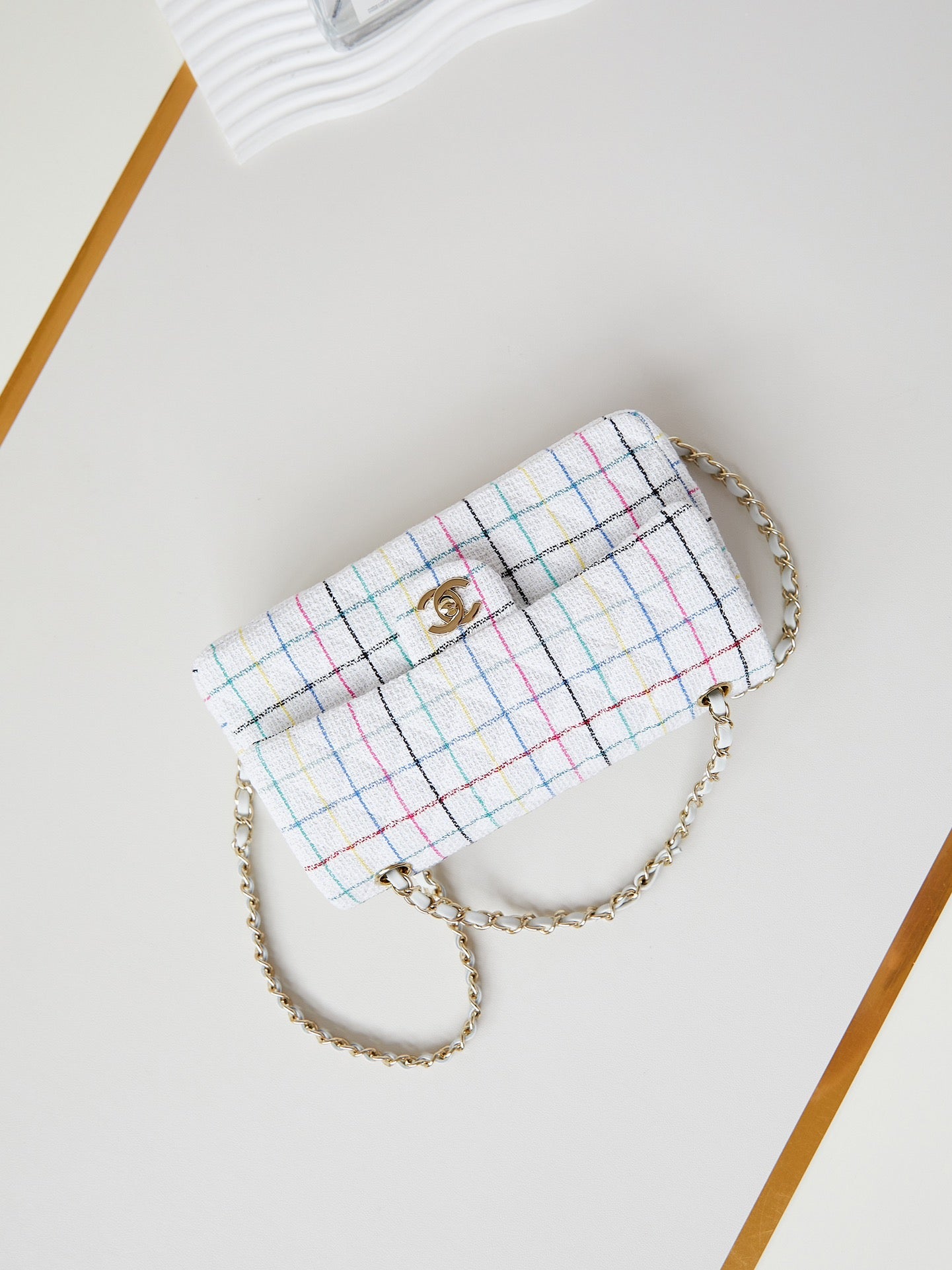 24p medium classic 25cm white tweed gold hardware