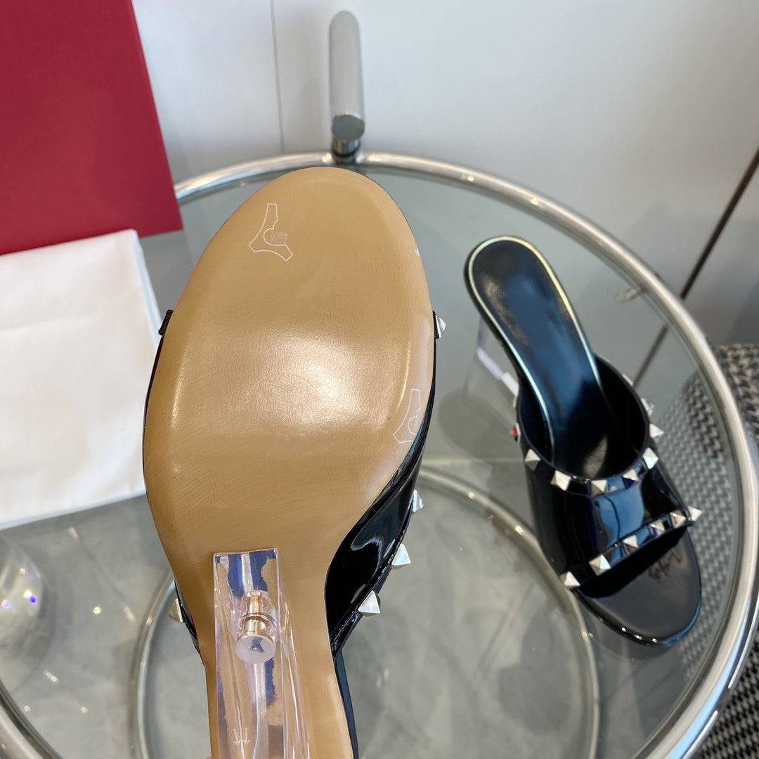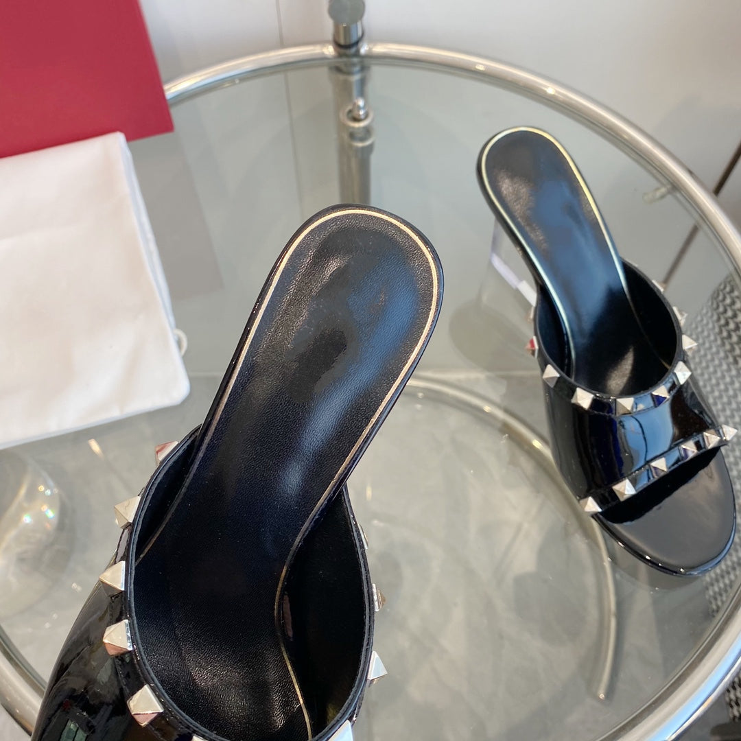 80mm Rockstud Patent Black Leather Mules