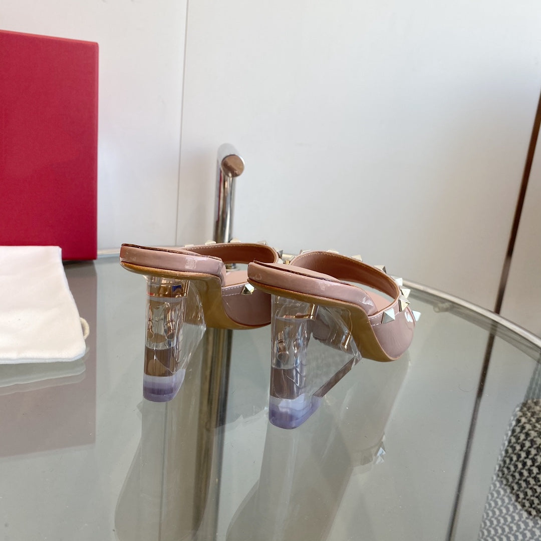 80mm Rockstud Patent Rose Cannelle Leather Mules