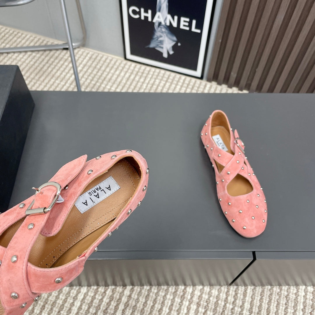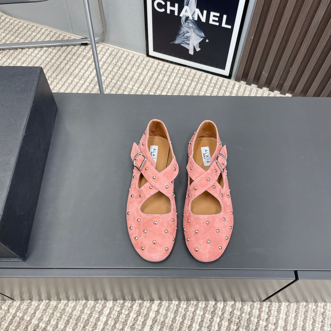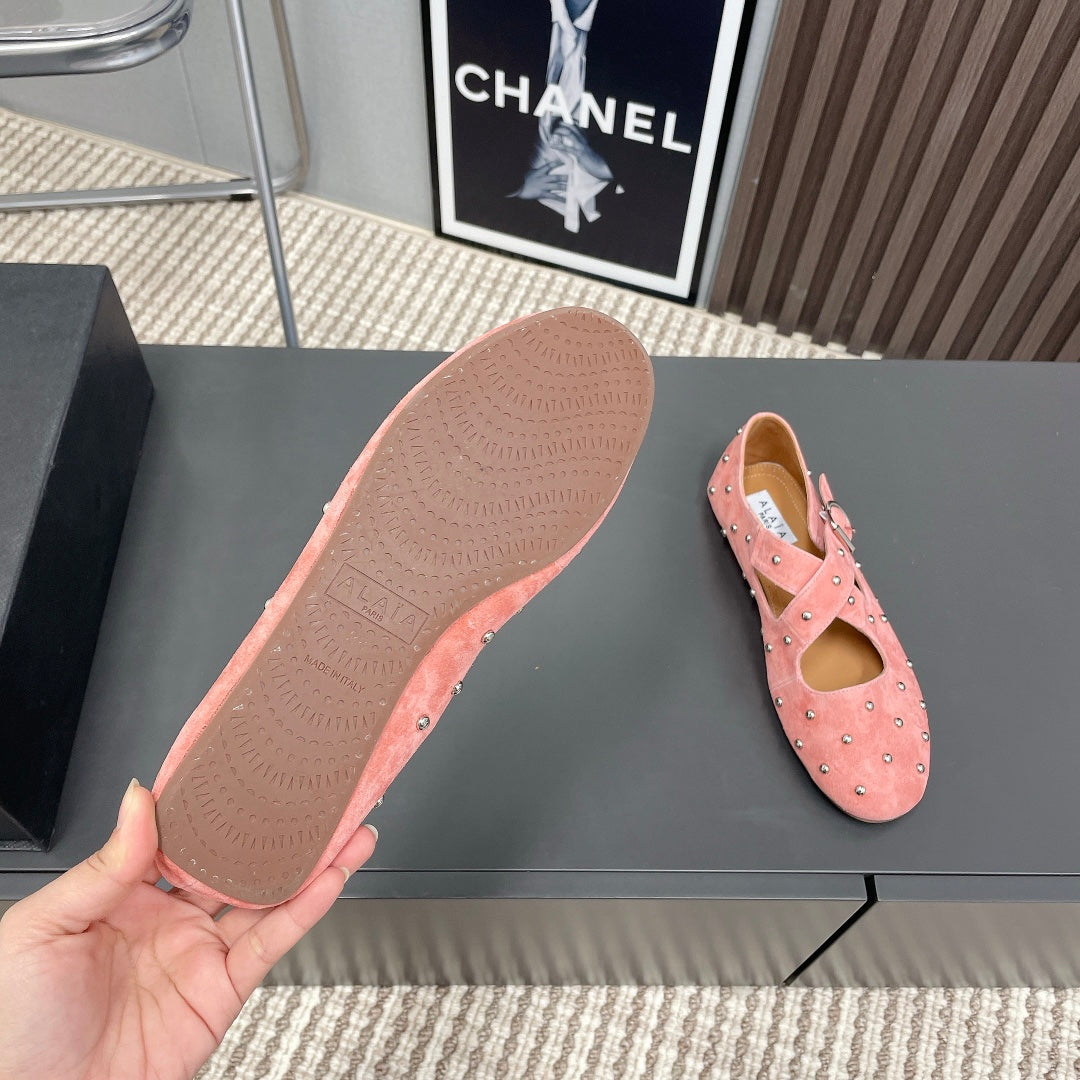Alaia 2025 Criss Cross With Stud Ballet Flats Pink Suede 293216