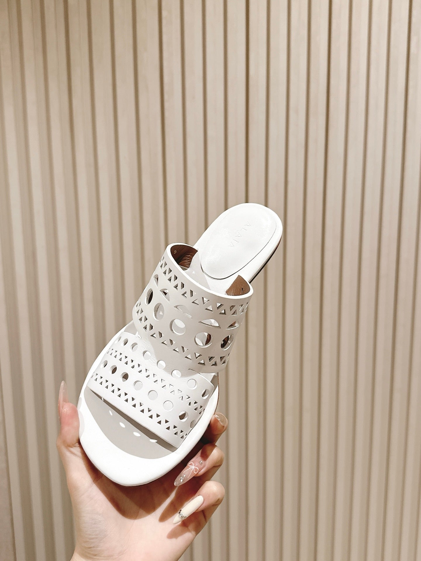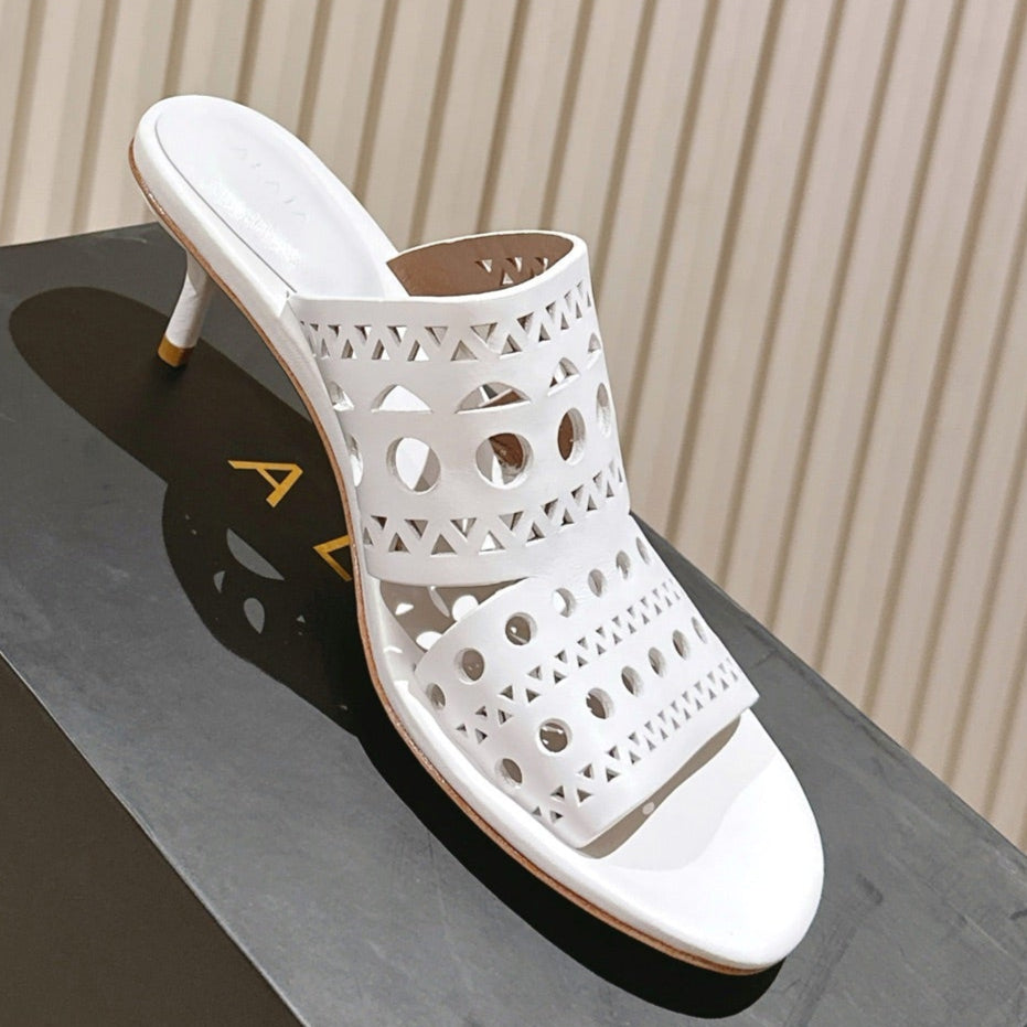 Alaia 2025 Vienne Cutout Kitten-Heel Slide Sandals White Leather 293650