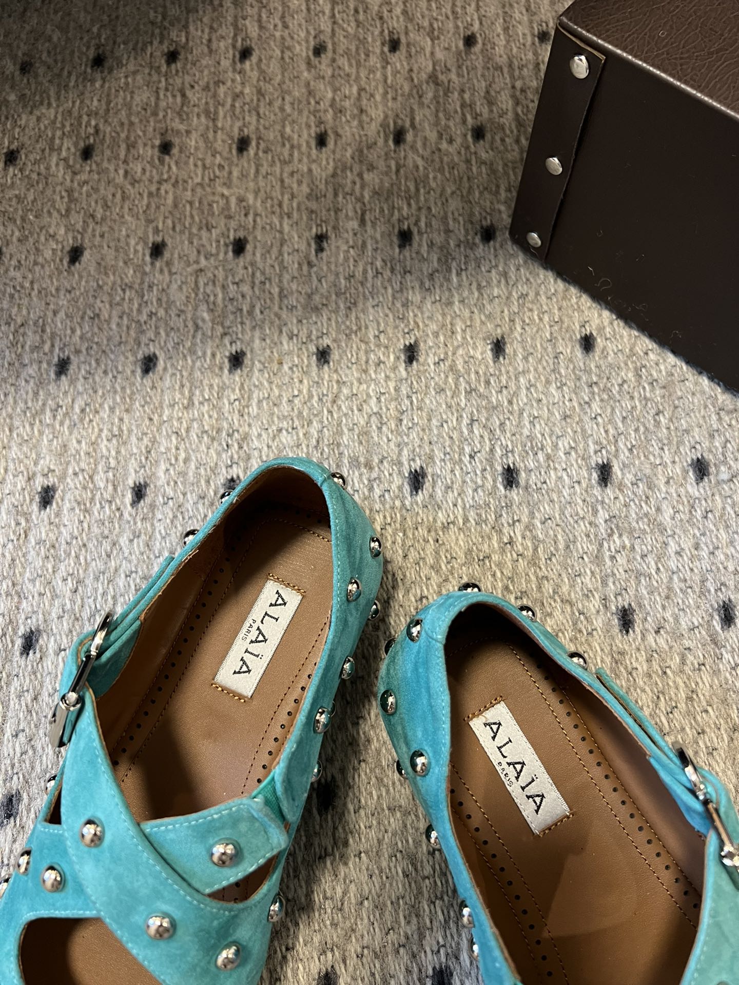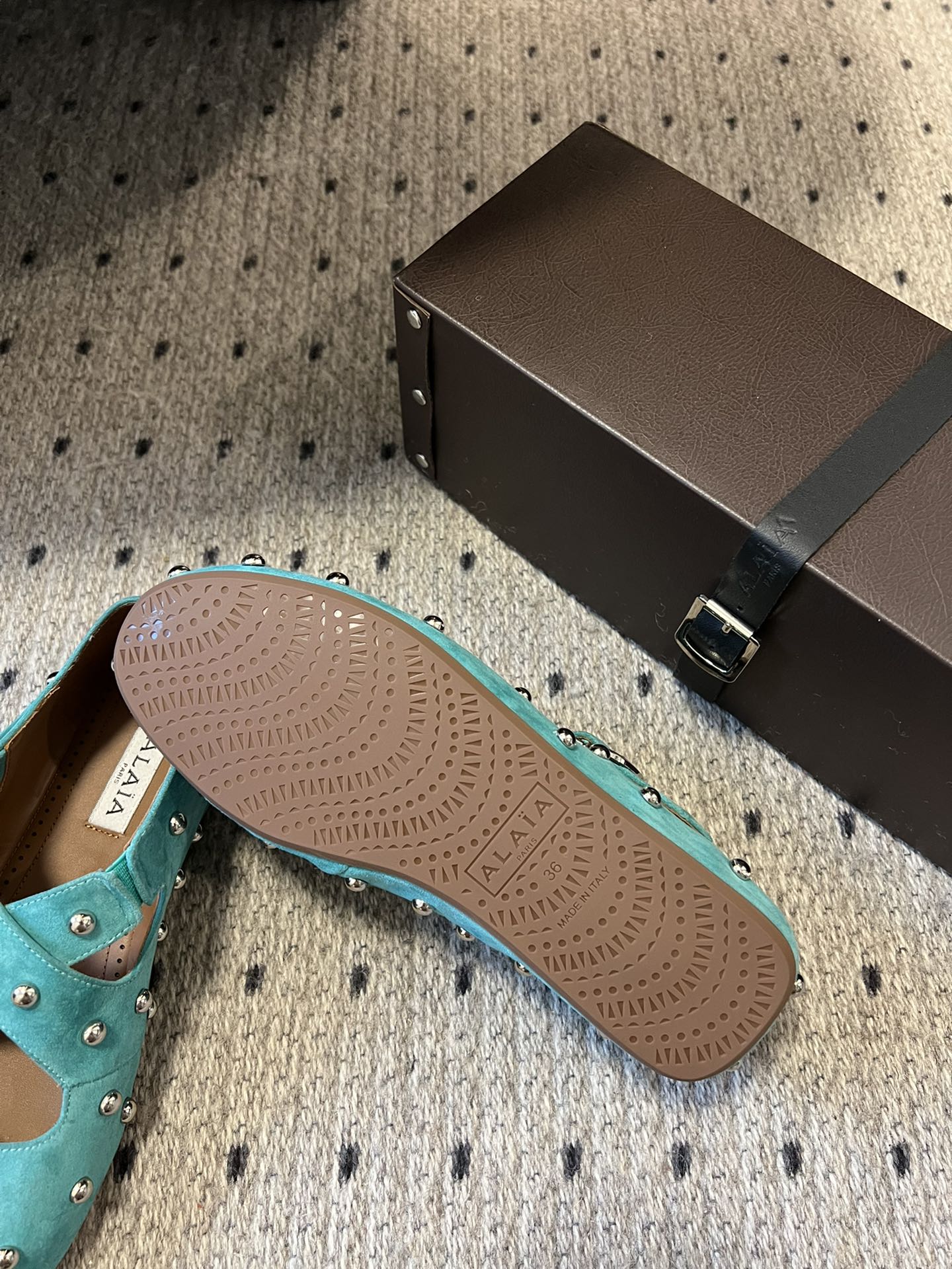Alaia 25 Criss Cross With Stud Ballet Flats Lagoon Green Suede Sheepskin 303692