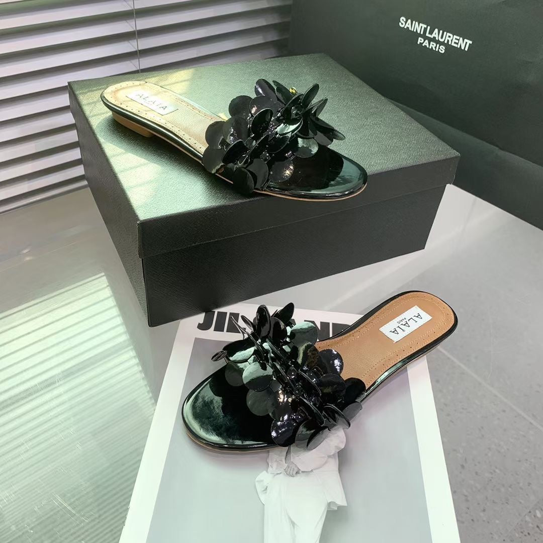 Alaia 25 Flower Slippers Glossy Black Sheepskin 293160