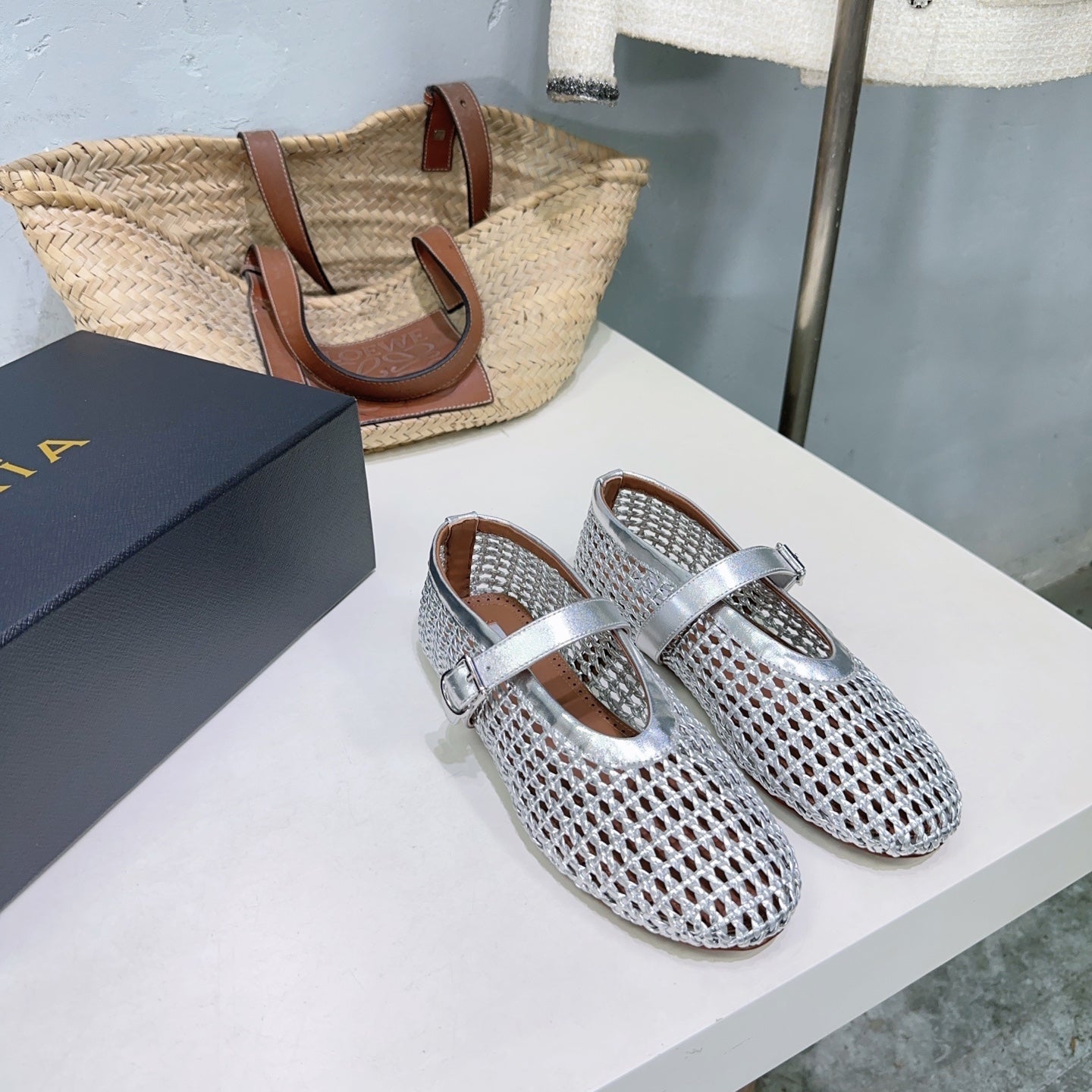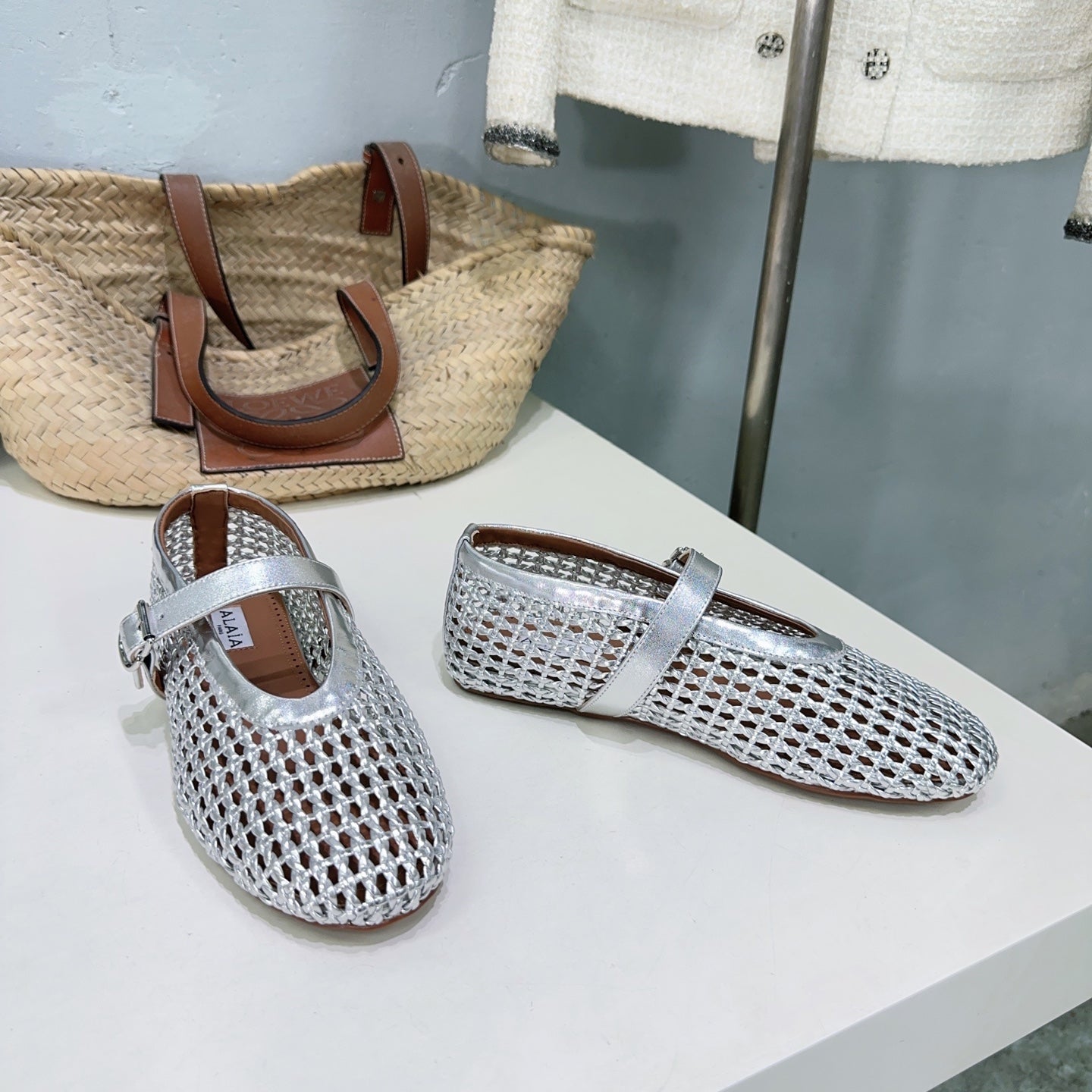 Alaia 25 Marry Janes Ballet Flats Silver Wool Sheepskin 300457