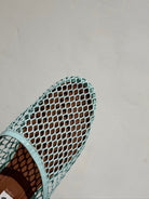 ALAIA FLAT MULES IN LIGHT BLUE MESH FISHNET