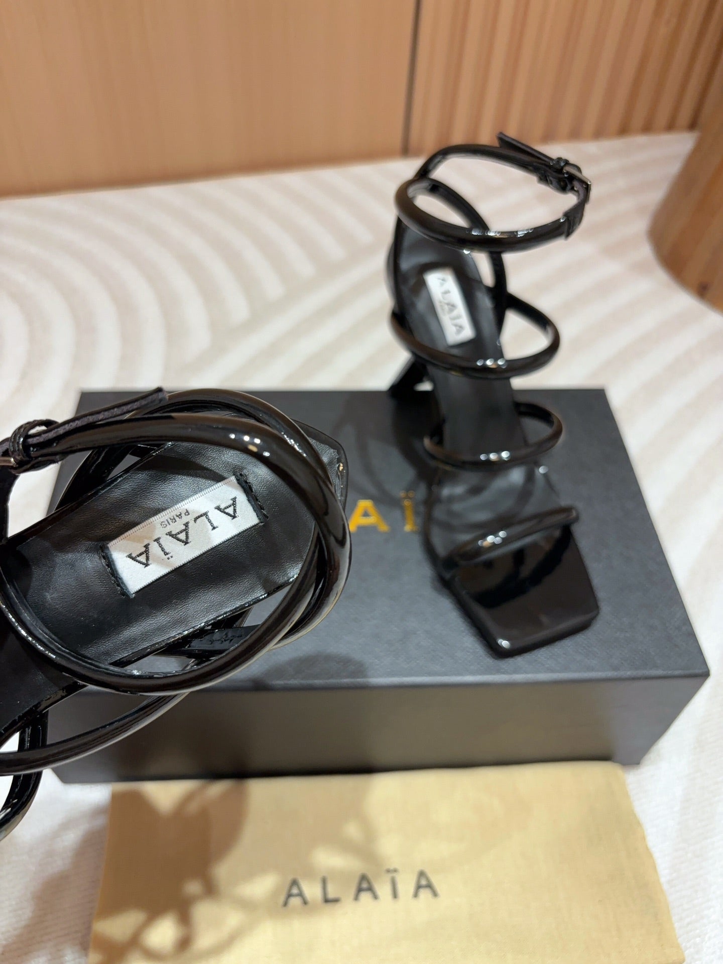 ALAIA THREE-STRAPS HIGH HEEL SANDALS IN BLACK PATENT LAMBSKIN