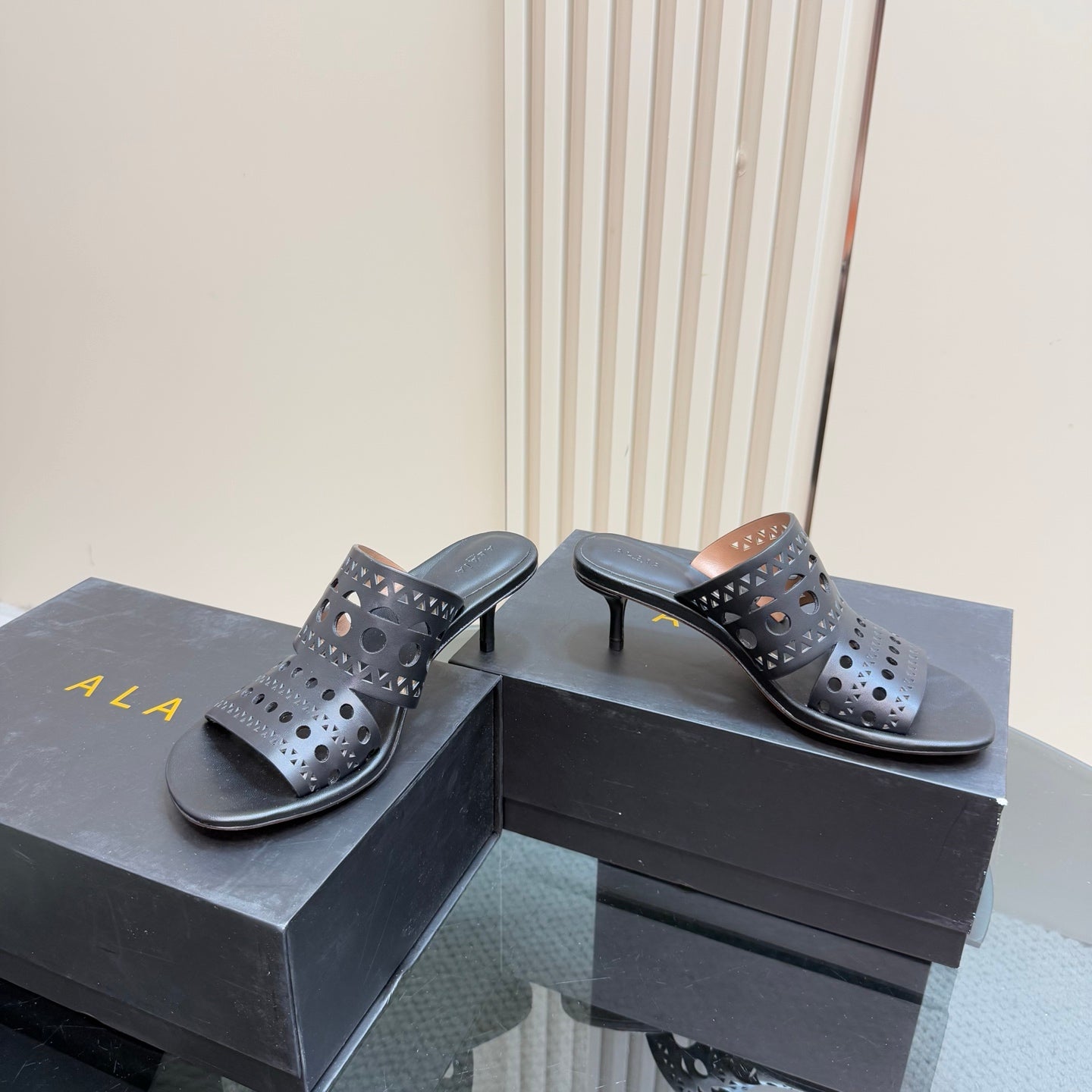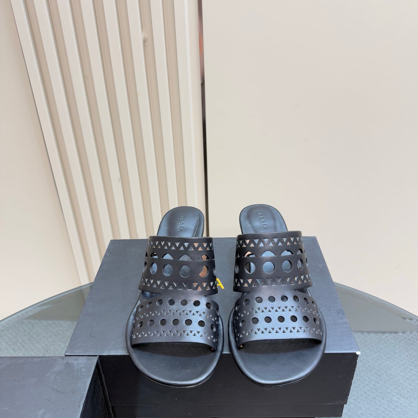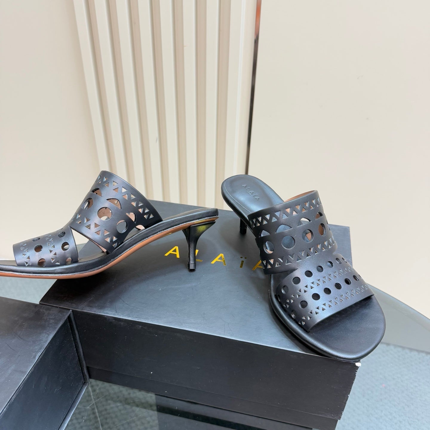 Alaia Vienne Cutout Kitten-Heel Slide Sandals Black Sheepskin 299661