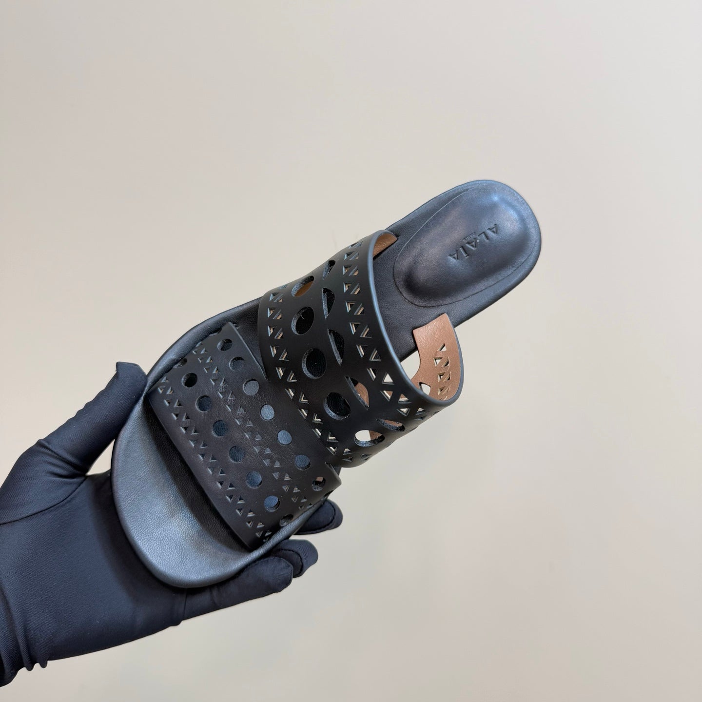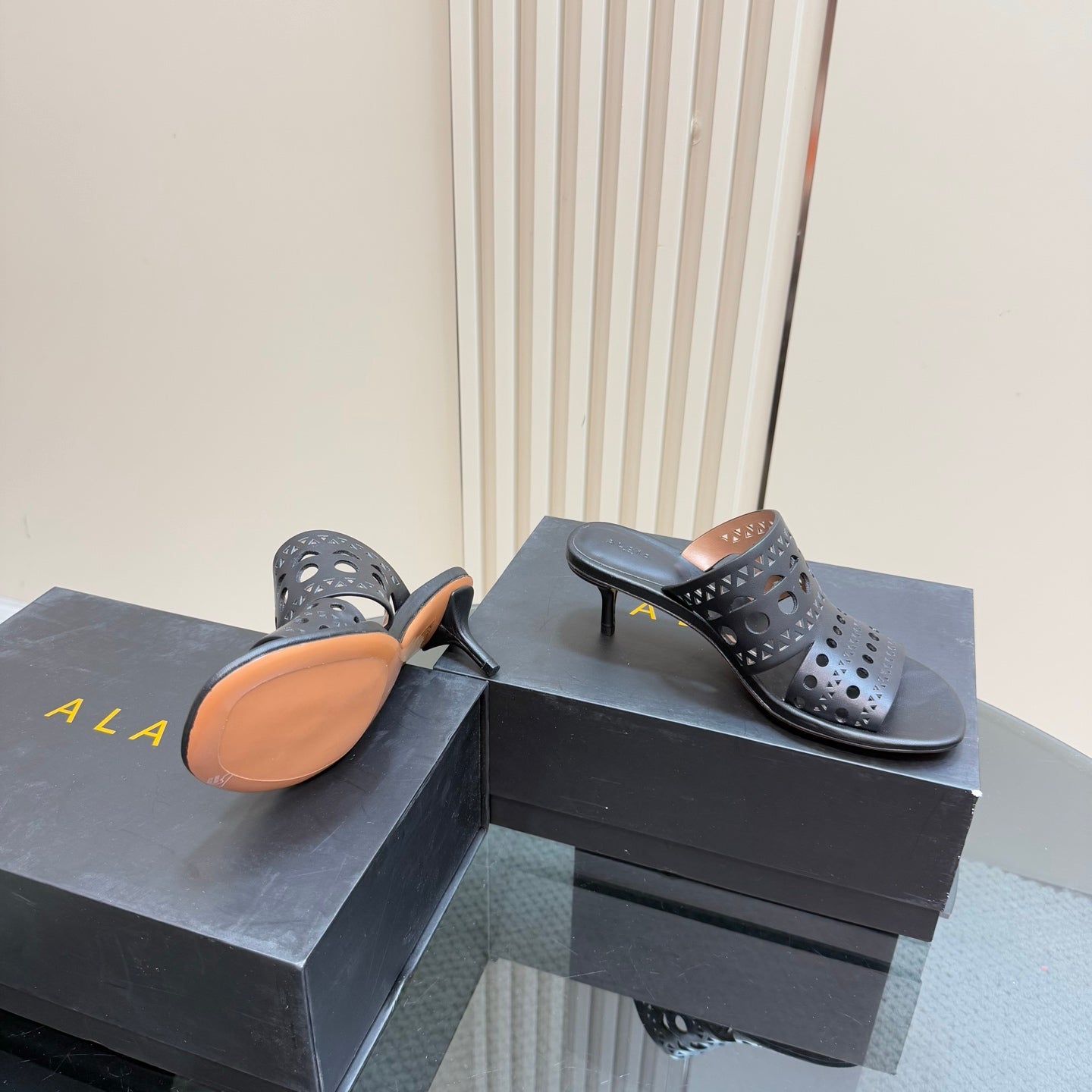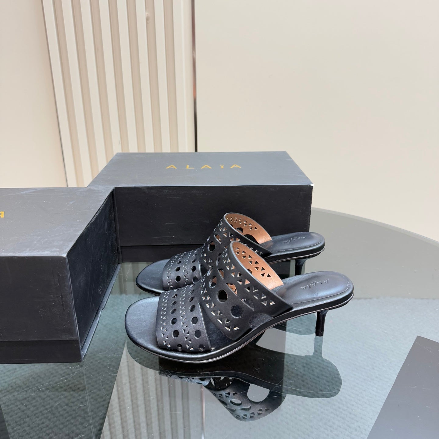Alaia Vienne Cutout Kitten-Heel Slide Sandals Black Sheepskin 299661