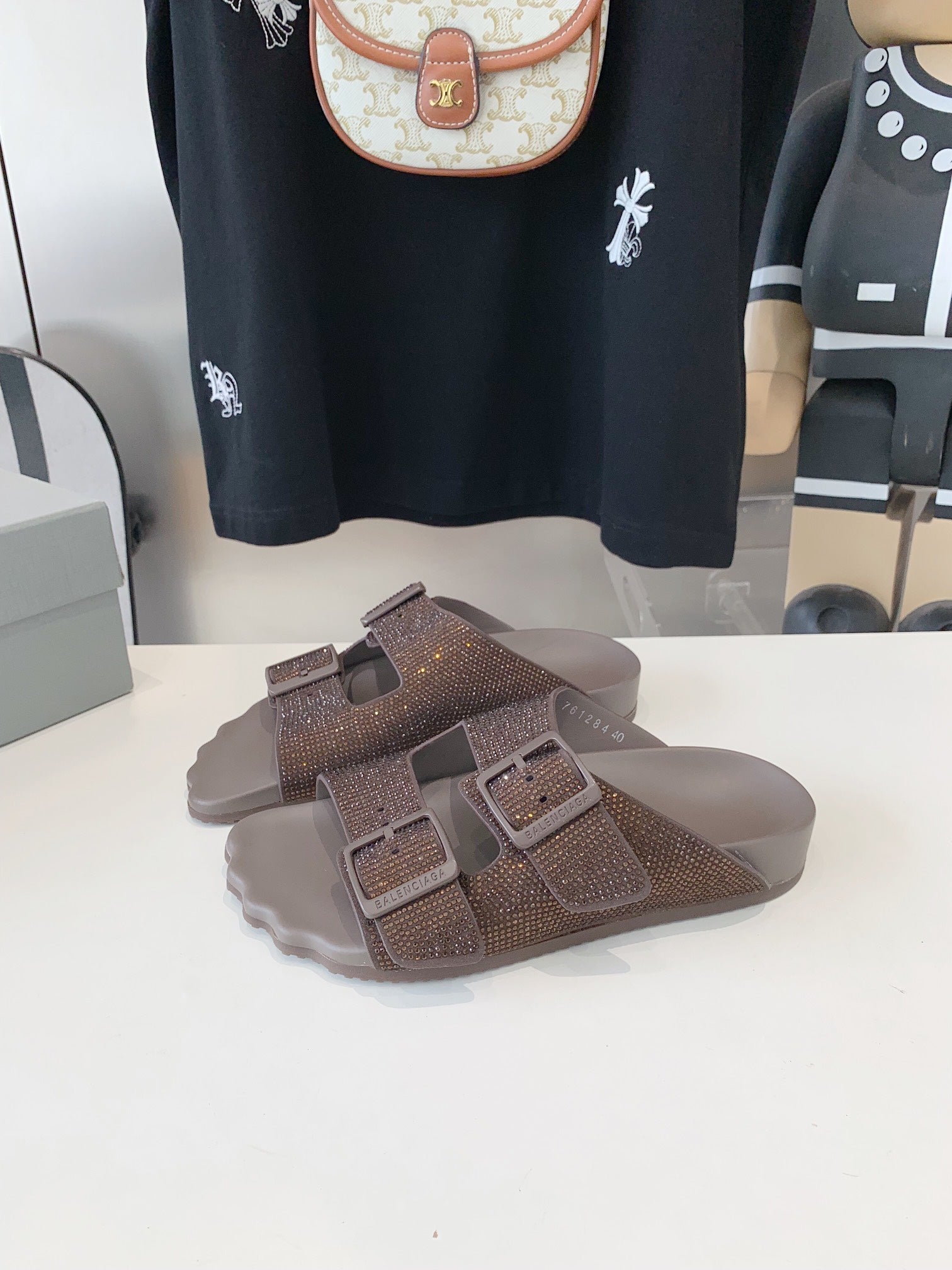 BIRKENSTOCK SLIPPERS ATTACHED RHINESTONES IN BROWN CALFSKIN