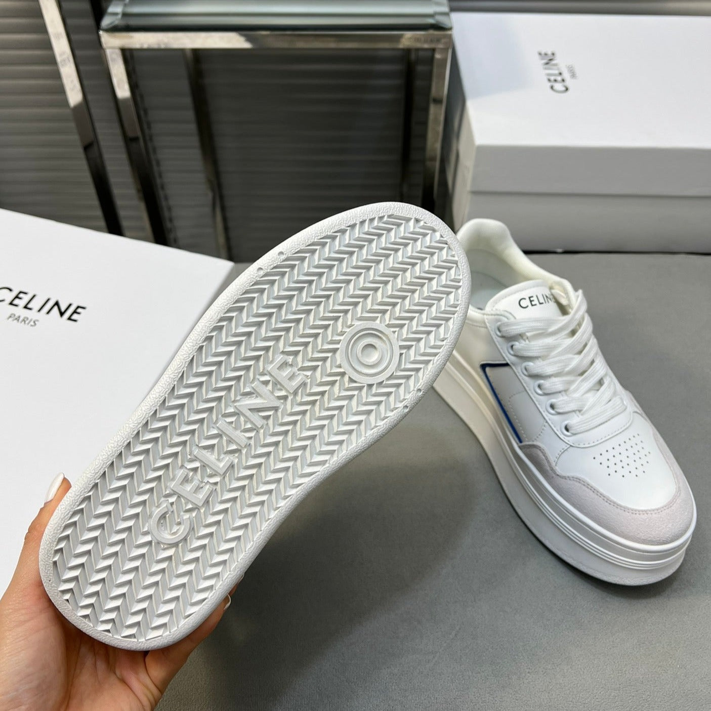 BLOCK SNEAKERS WITH WEDGE OUTSOLE IN CALFSKIN OPTIC WHITE/BLUE/RED/SILVER