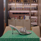 BOW-EMBELLISHED HIGH MULES IN SILVER METALLIC SHEEPSKIN
