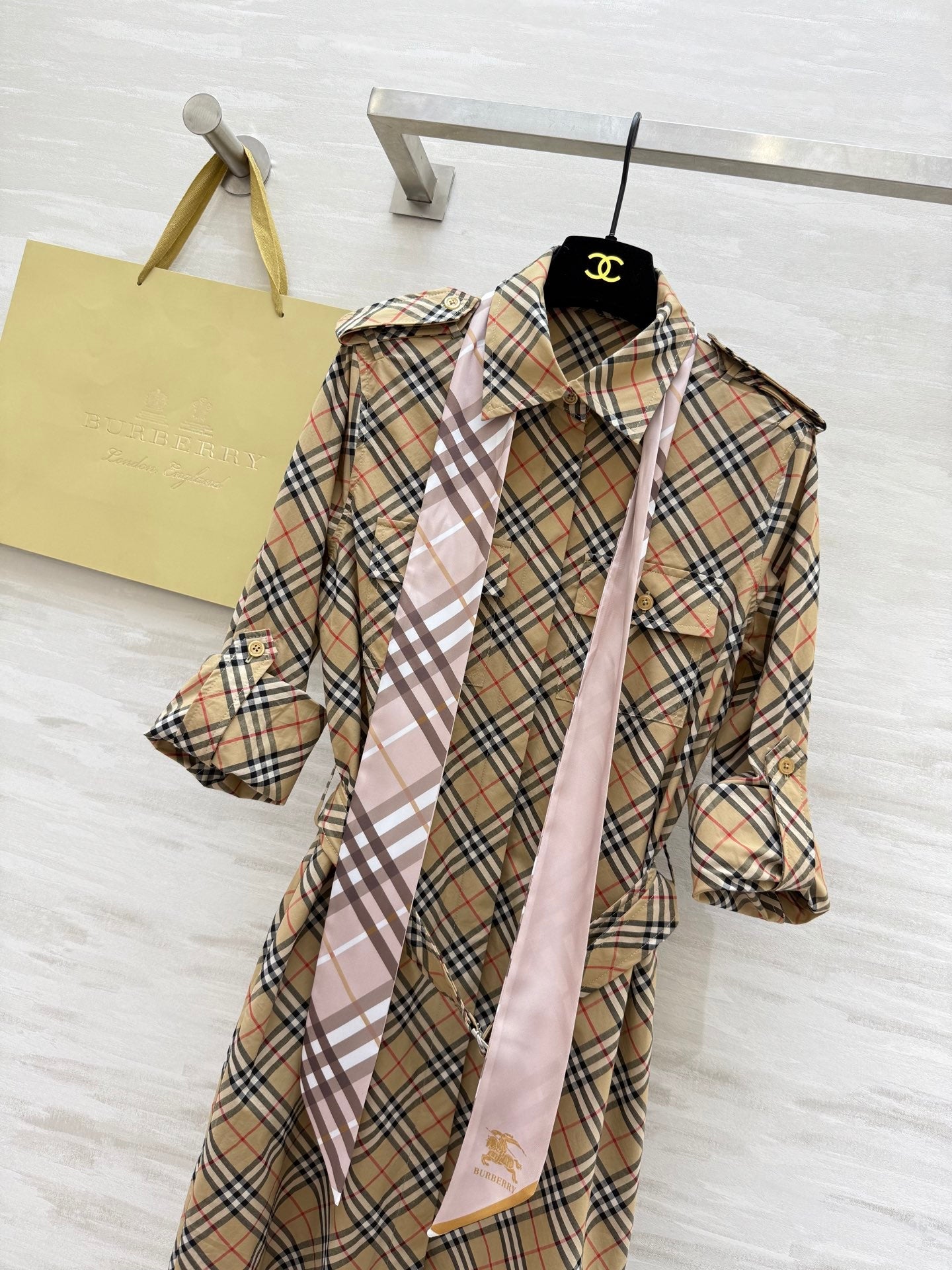 • Color: Beige plaid