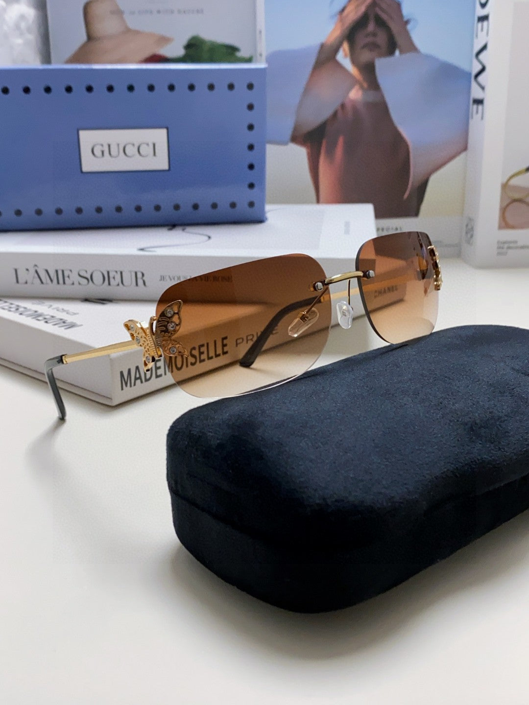 BUTTERFLY EMBELLISHED RIMLESS RECTANGULAR FRAME SUNGLASSES 570245 IN METAL