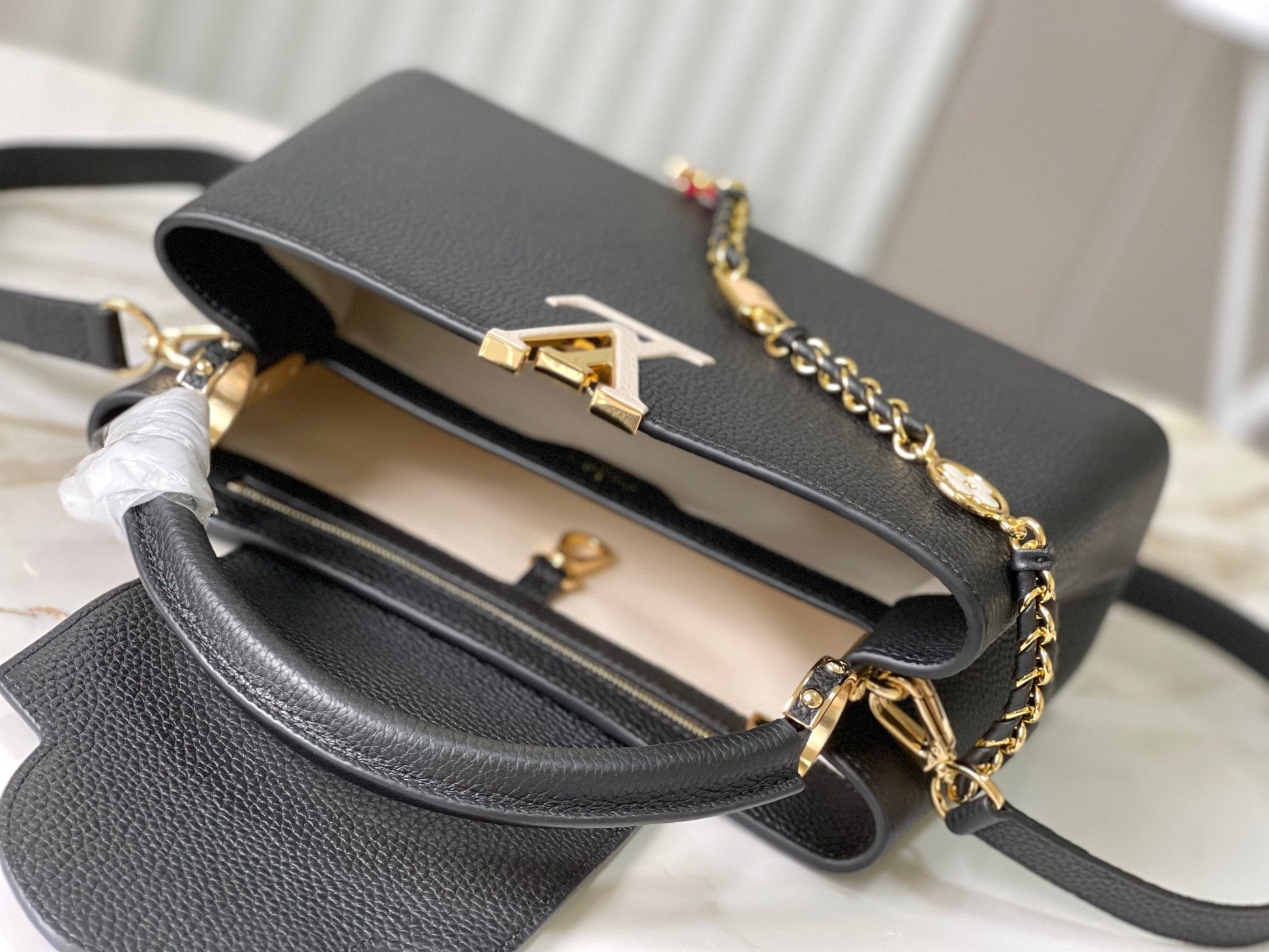capucines mm 31.5 black taurillon leather gold hardware