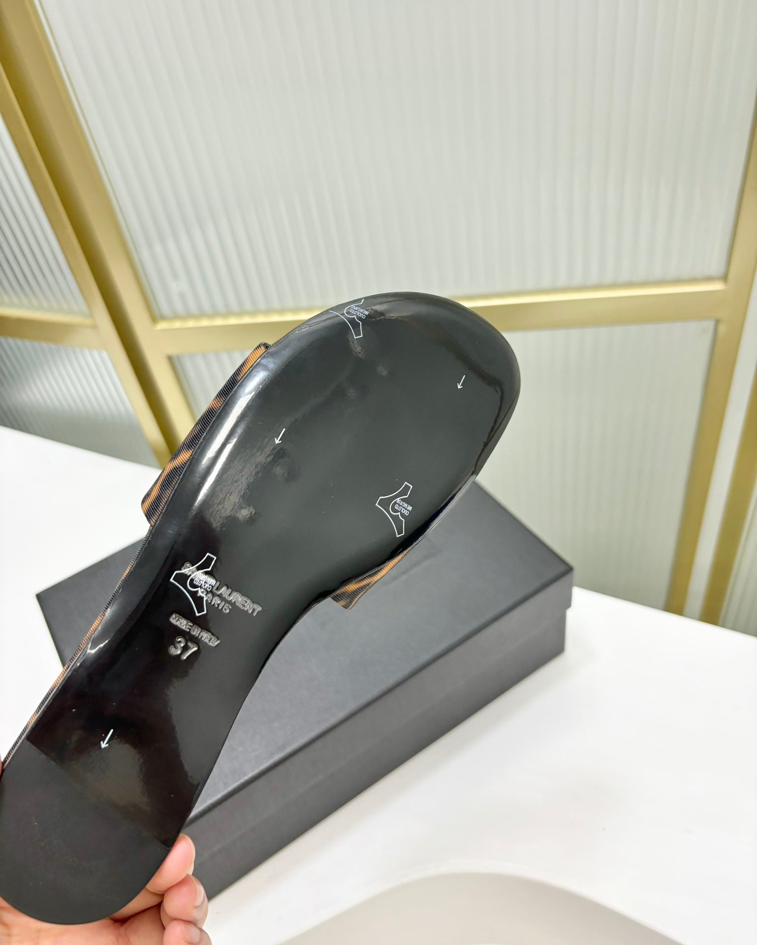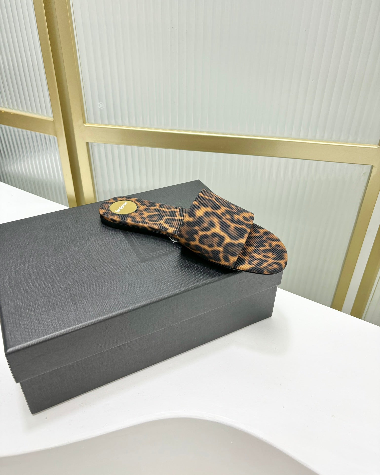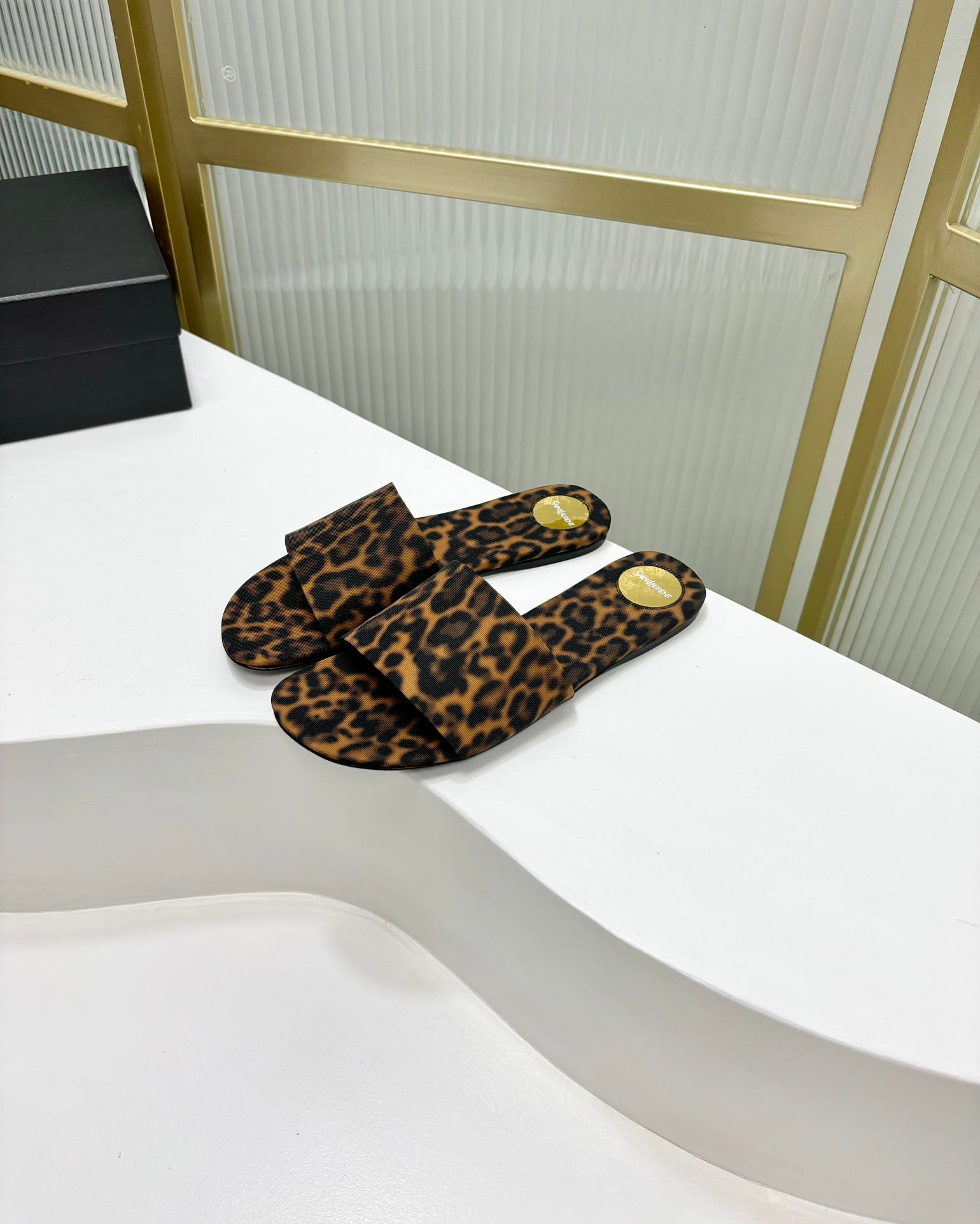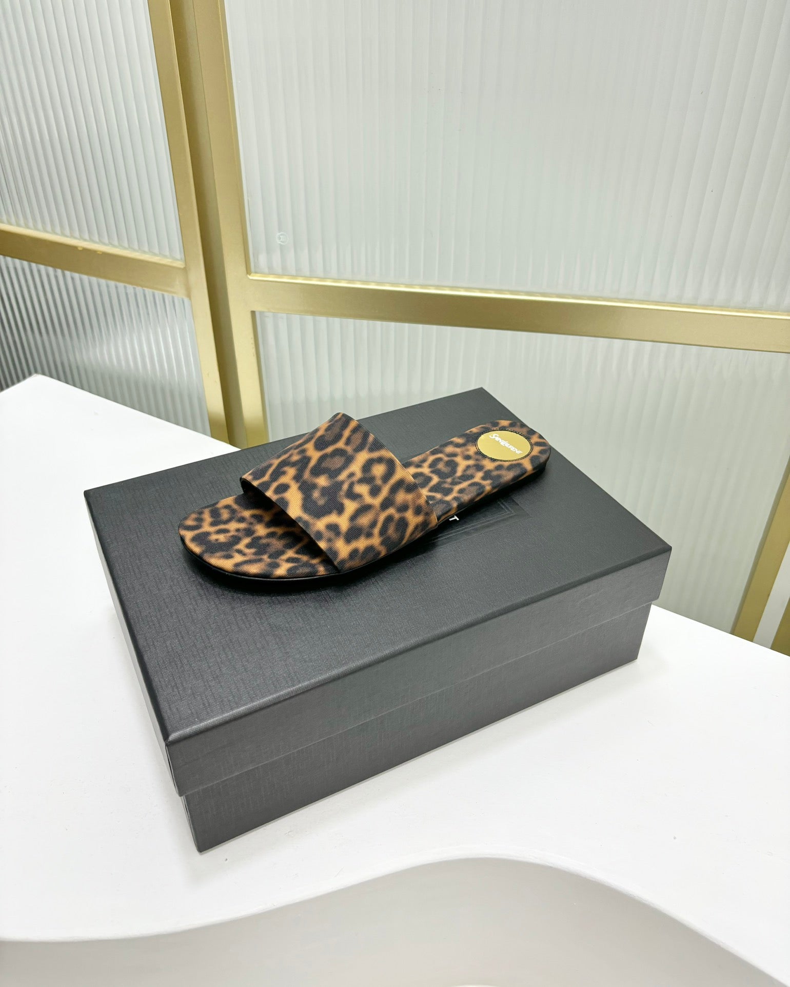 CARLYLE SLIDES IN LEOPARD GROSGRAIN BLACK GOLD