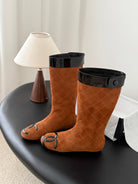 CC 2025 Vintage Cambon Mid-Calf Boots Brown Black Suede Patent Leather 550642