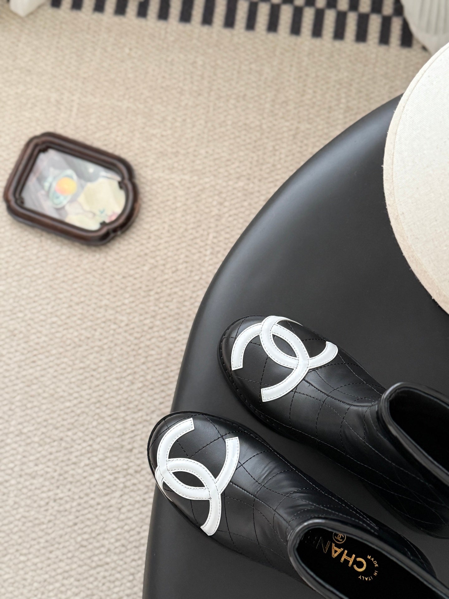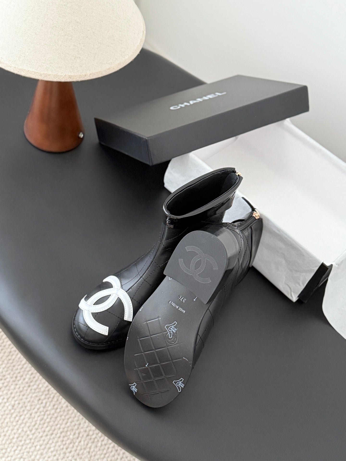CC 2025 Vintage Cambon Mid-Calf Short Boots Black White Cowhide 550634