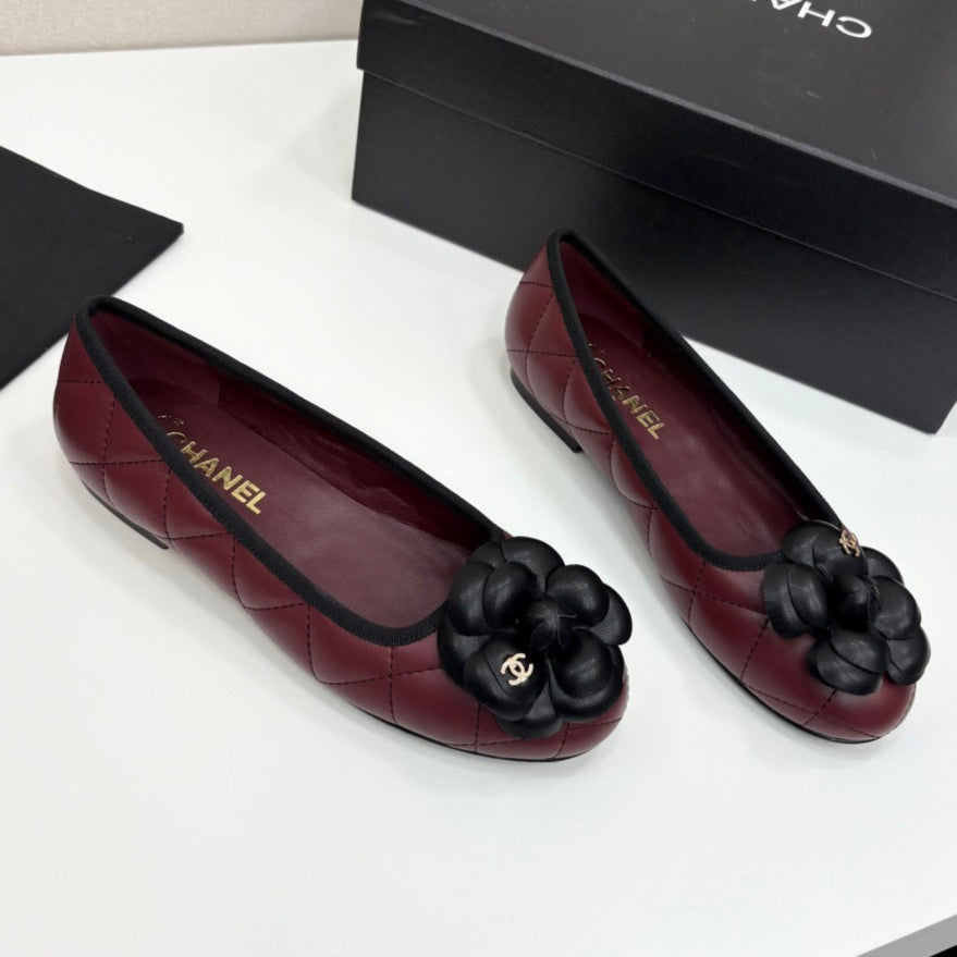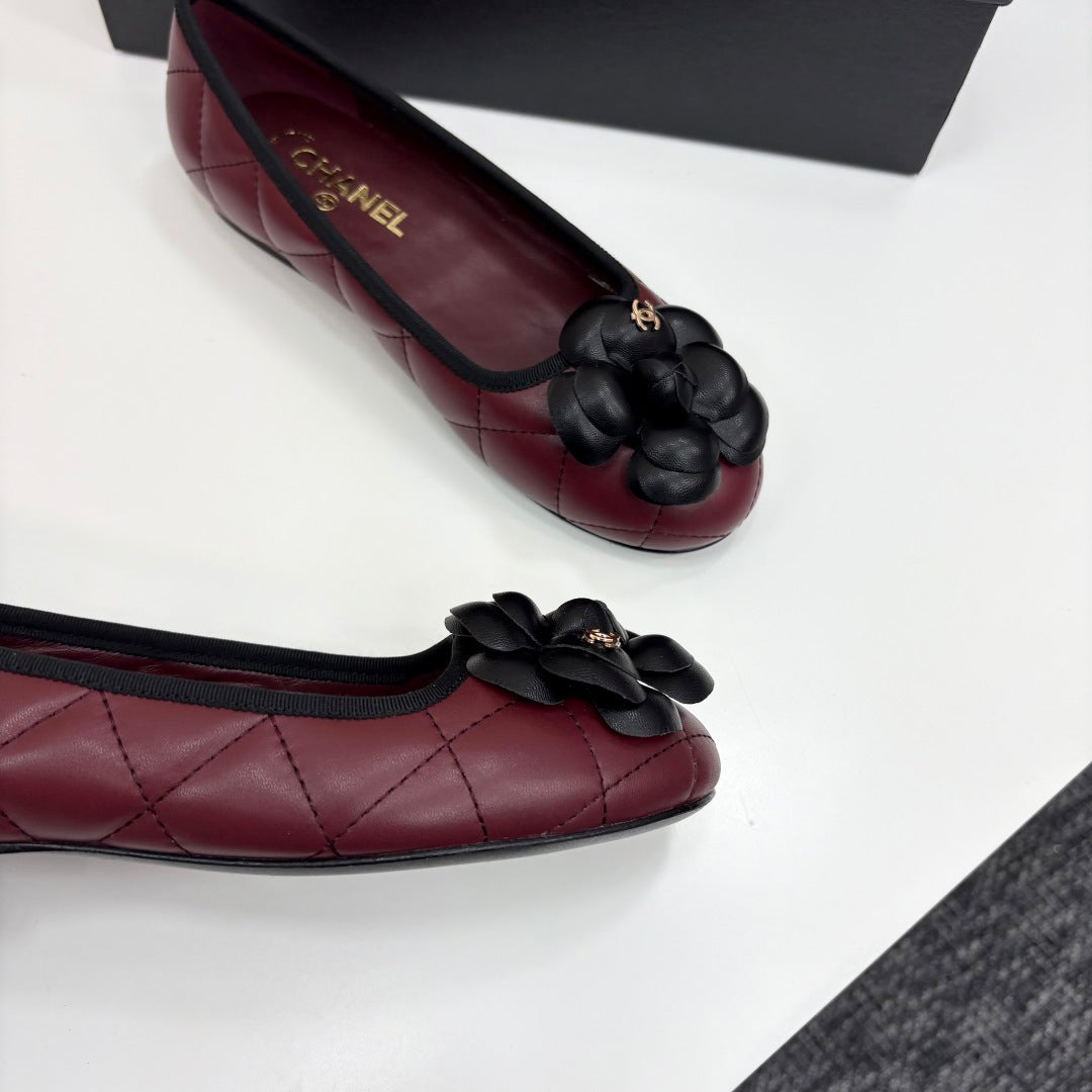 CC 25 Ballet Flat Flower Burgundy Quilted Calfskin