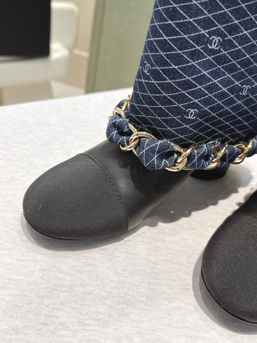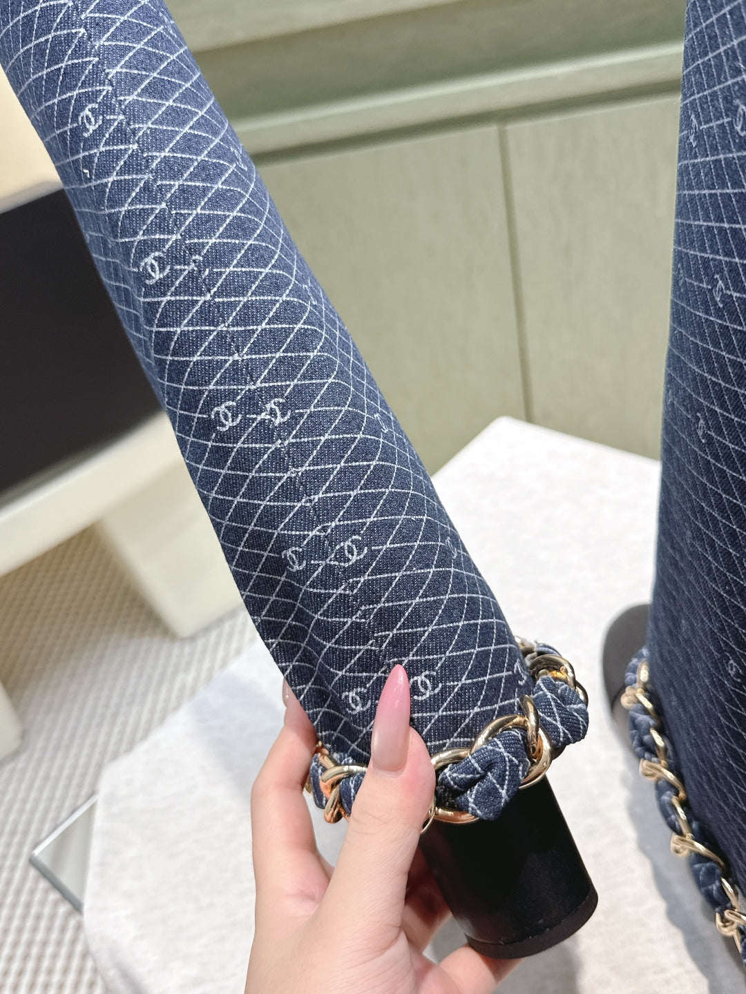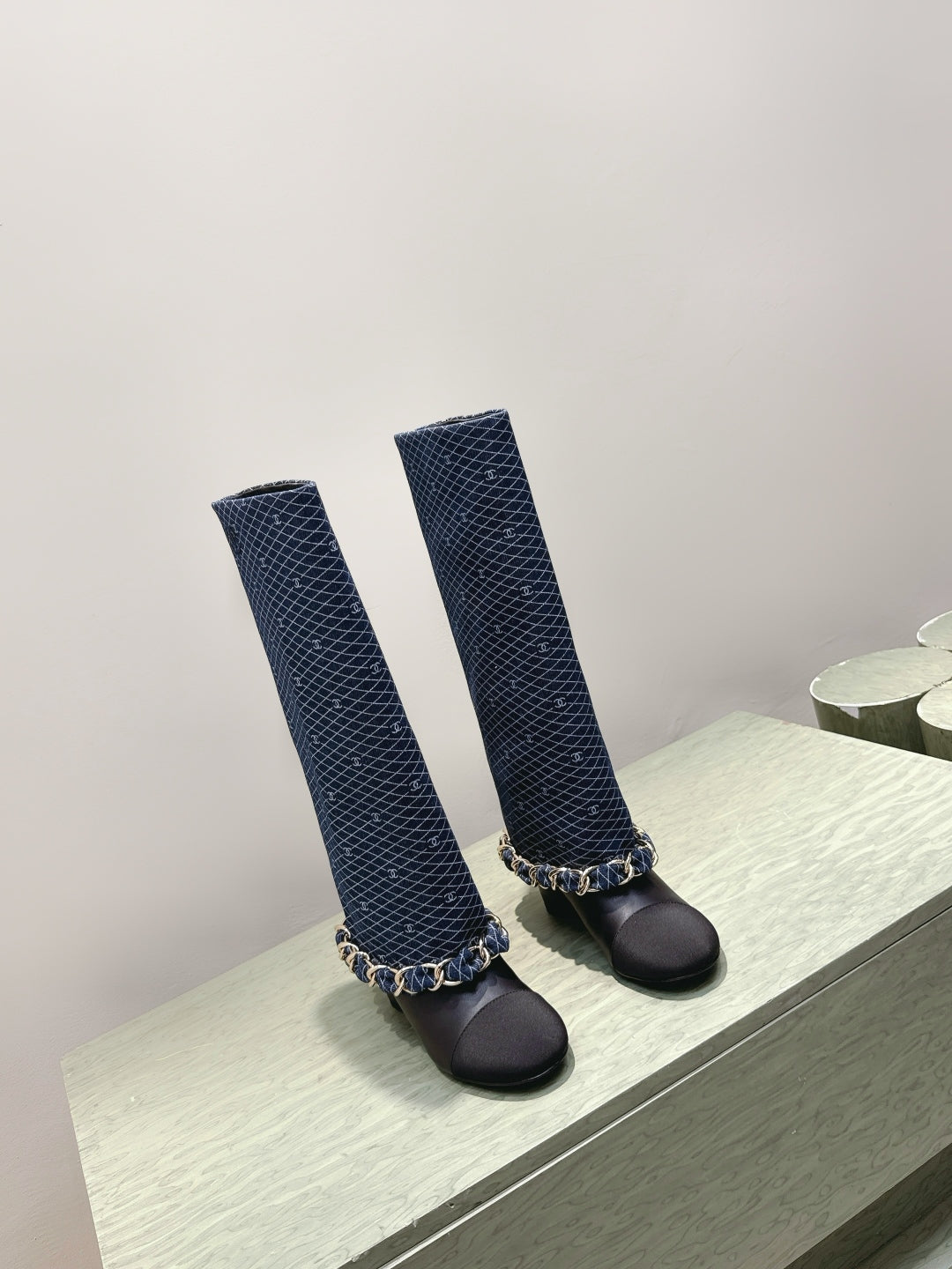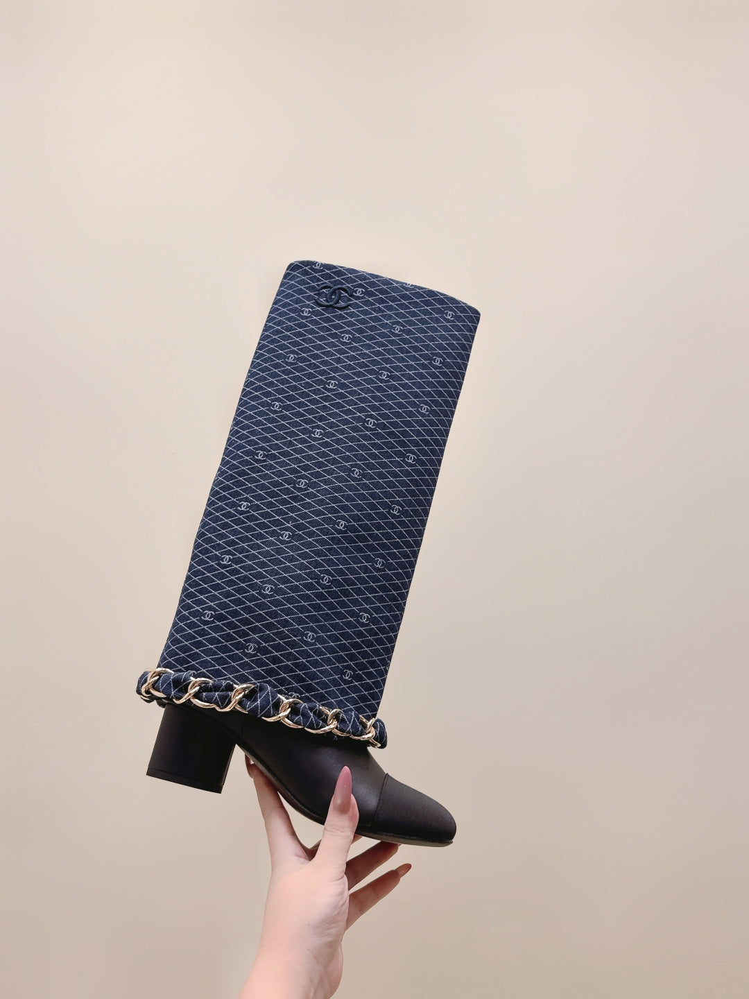 CC 25 Long Boot Navy Blue Black Denim Fabric Calfskin 515273