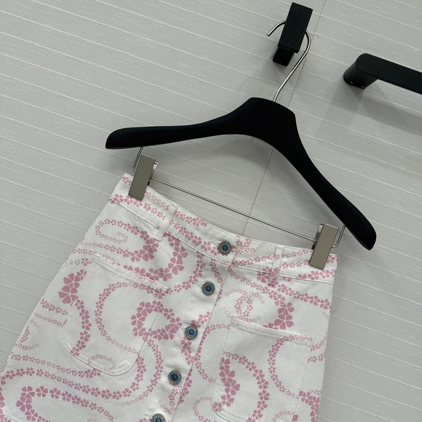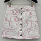 CC 25 Printed Denim Single-breasted Short Skirt Pink White Cotton