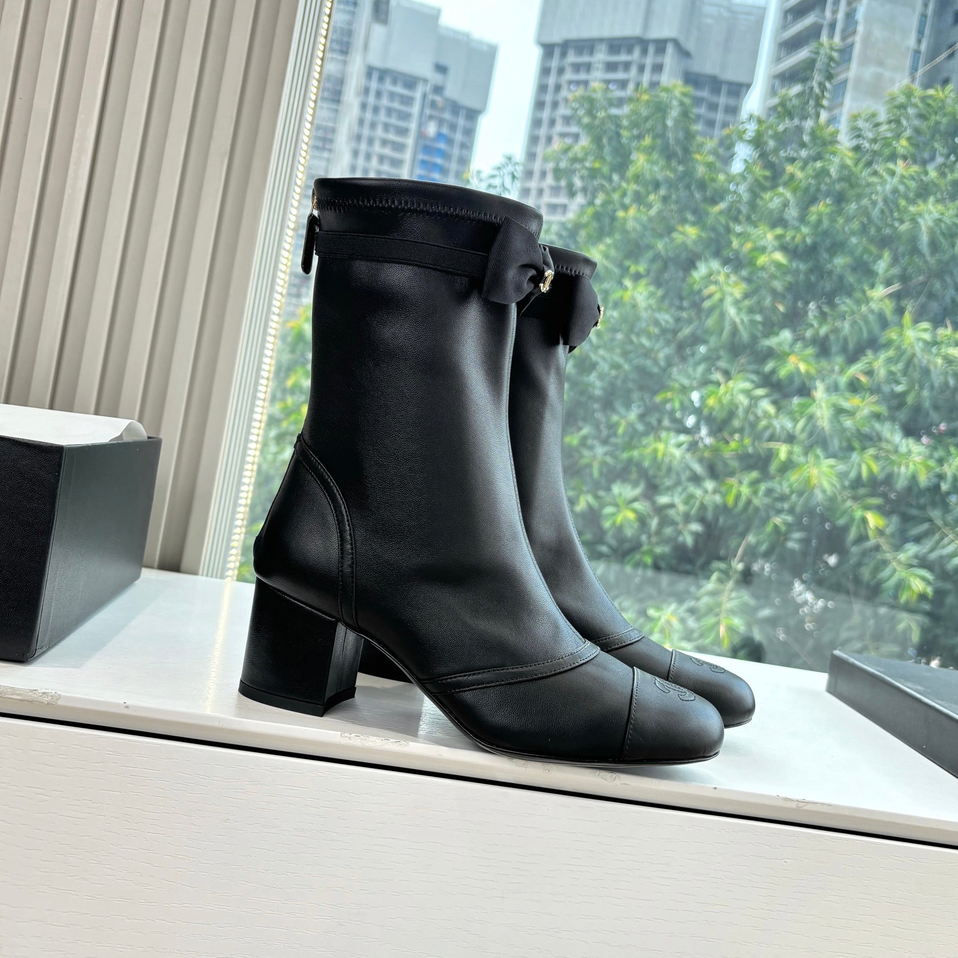 CC 25 Short Boot Black Calfskin Black Bow 430319