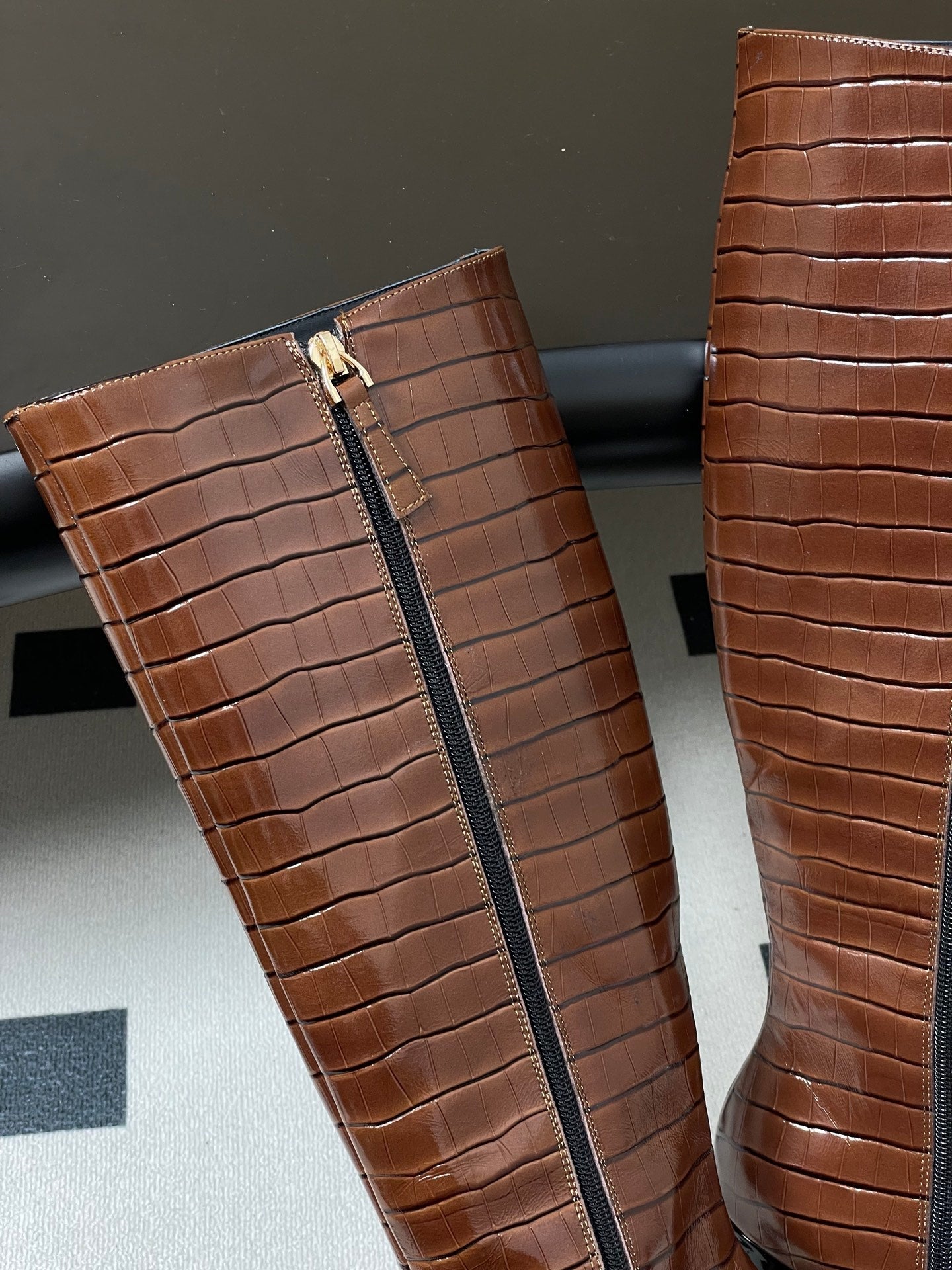 CC 26 Crocodile-embossed High Boot Black Brown Patent Leather 593110