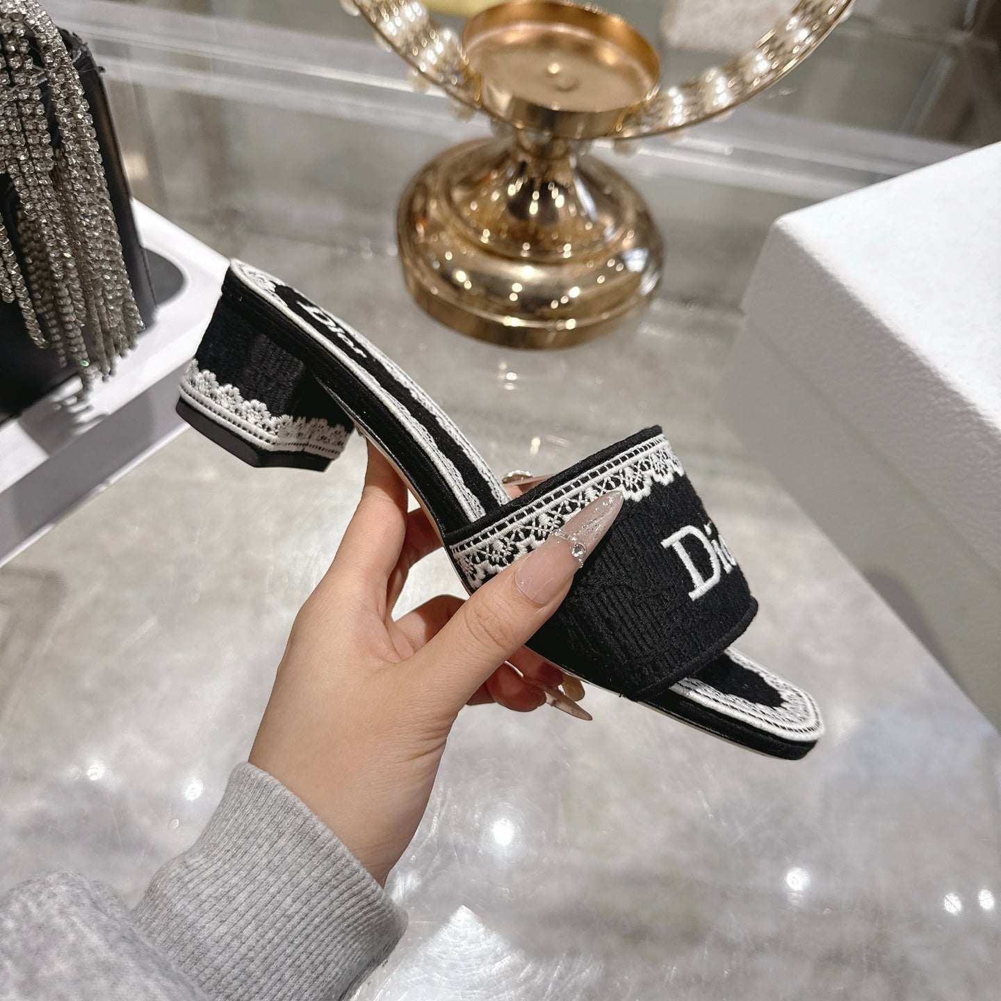 CD 26 Embroidered Sandals 45mm Black White Canvas 592240
