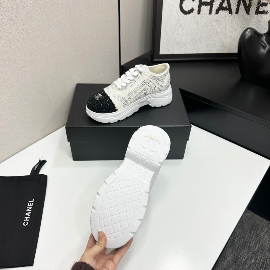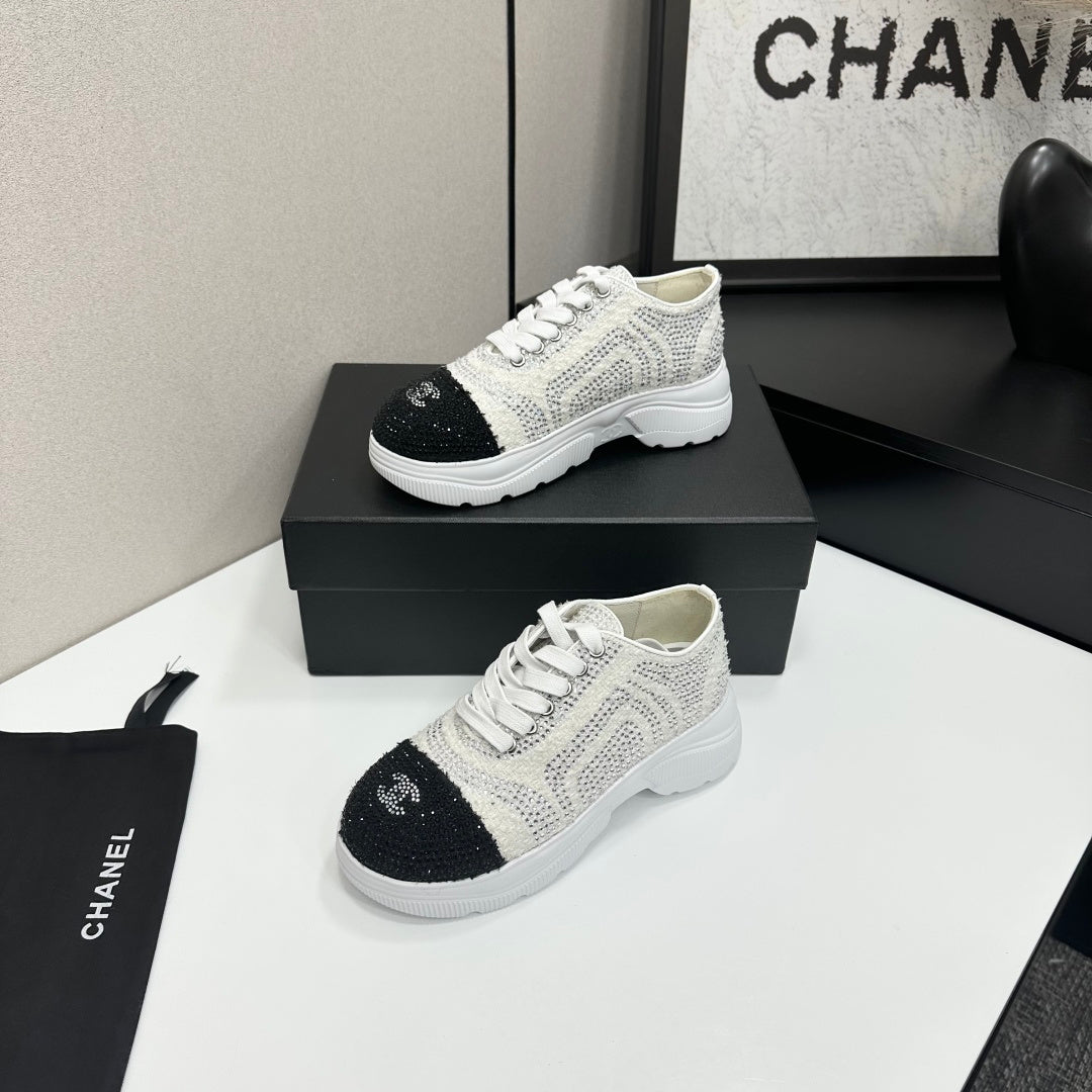 CC 26s Casual Sneakers Rhinestones Ivory Black Mesh Sheepskin 626361