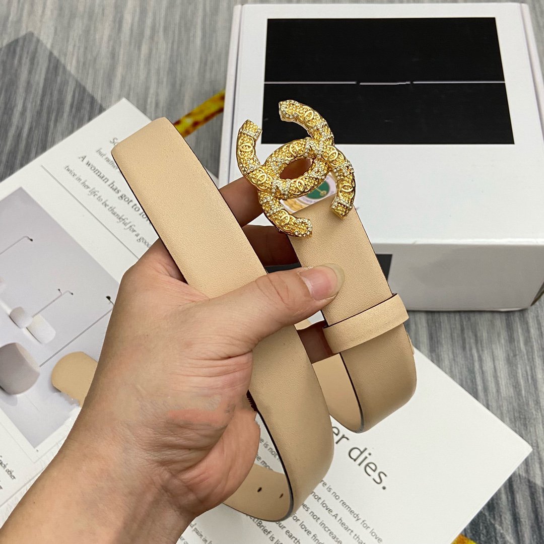 CC BELT 30MM BUCKLE GOLD DIAMOND LEATHER BEIGE
