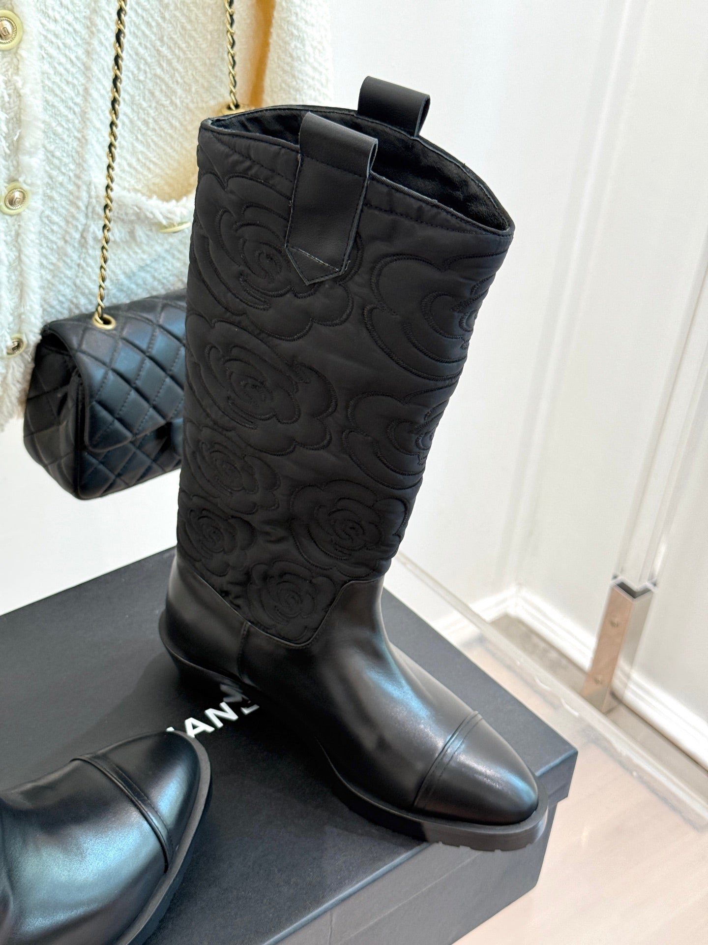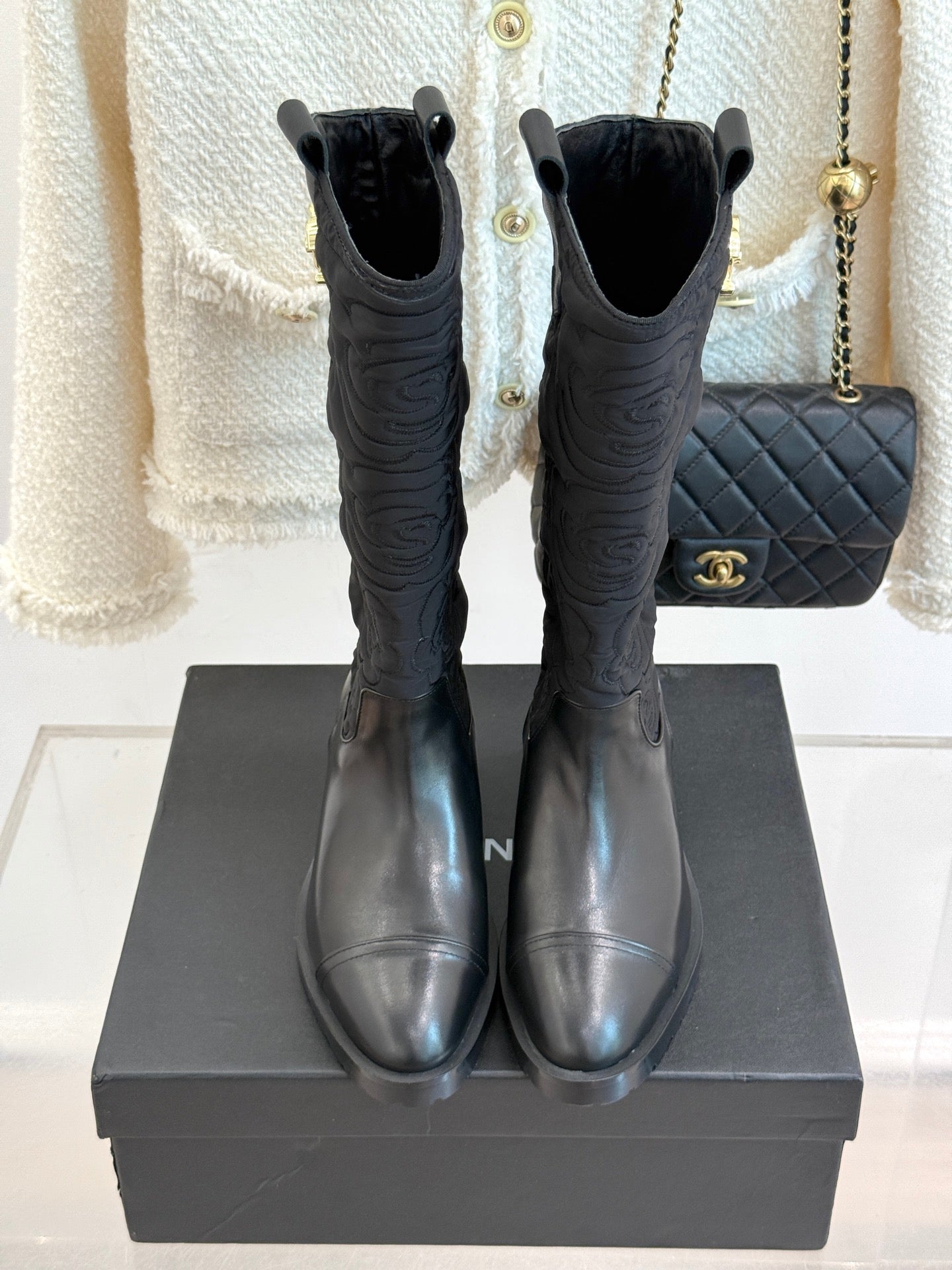 CC cowboy mid-calf boots black sheepskin denim fabric 511980