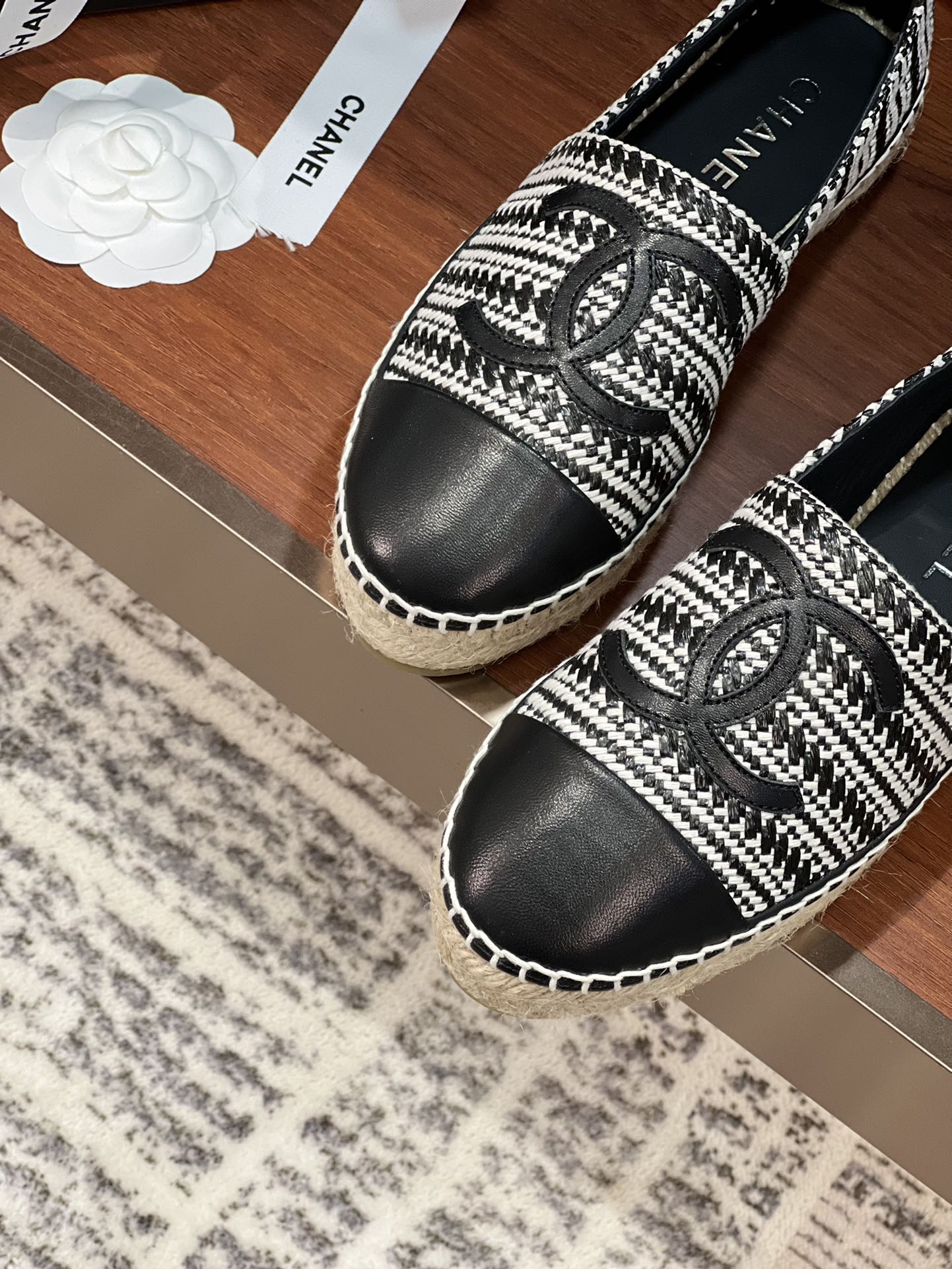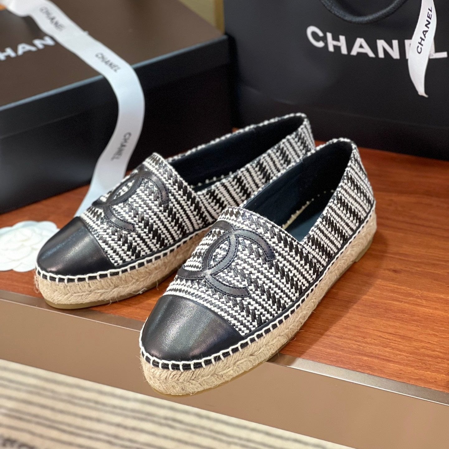 cc espadrilles black white woolen cloth black lambskin