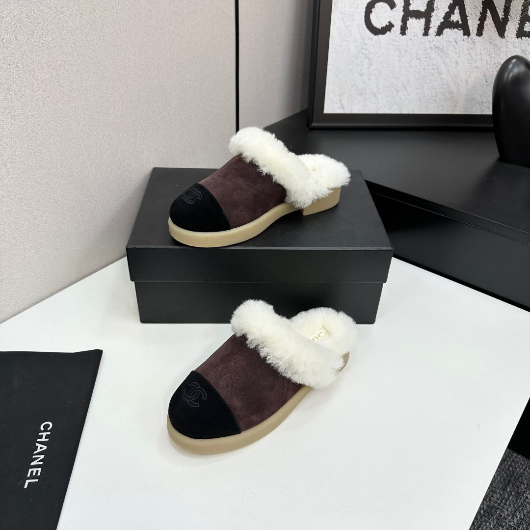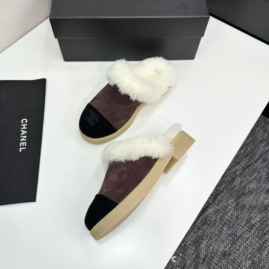 CC furry mule dark brown black suede and wool 532572