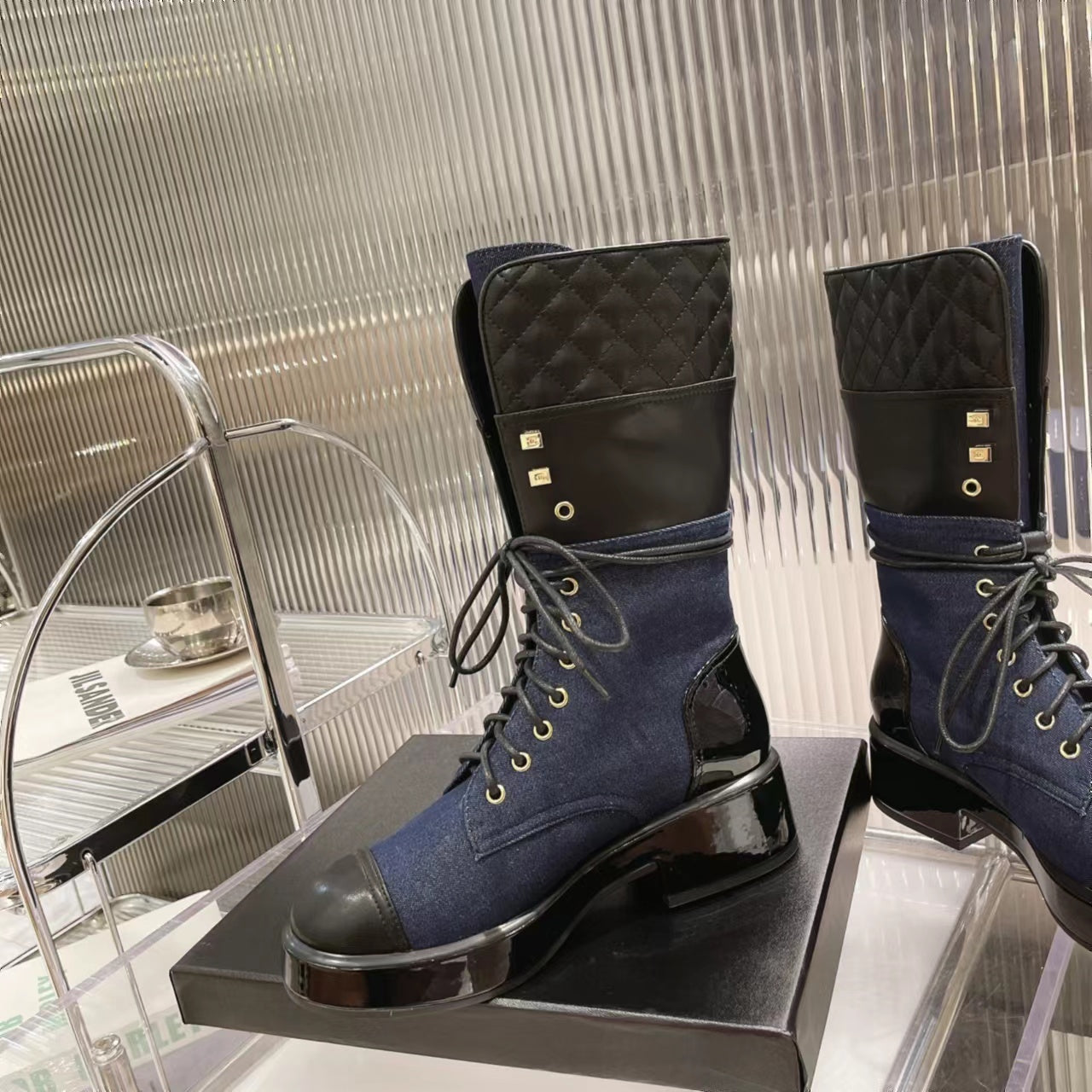 CC High Boots 45mm Dark Blue Denim Fabric And Quilted Cowhide