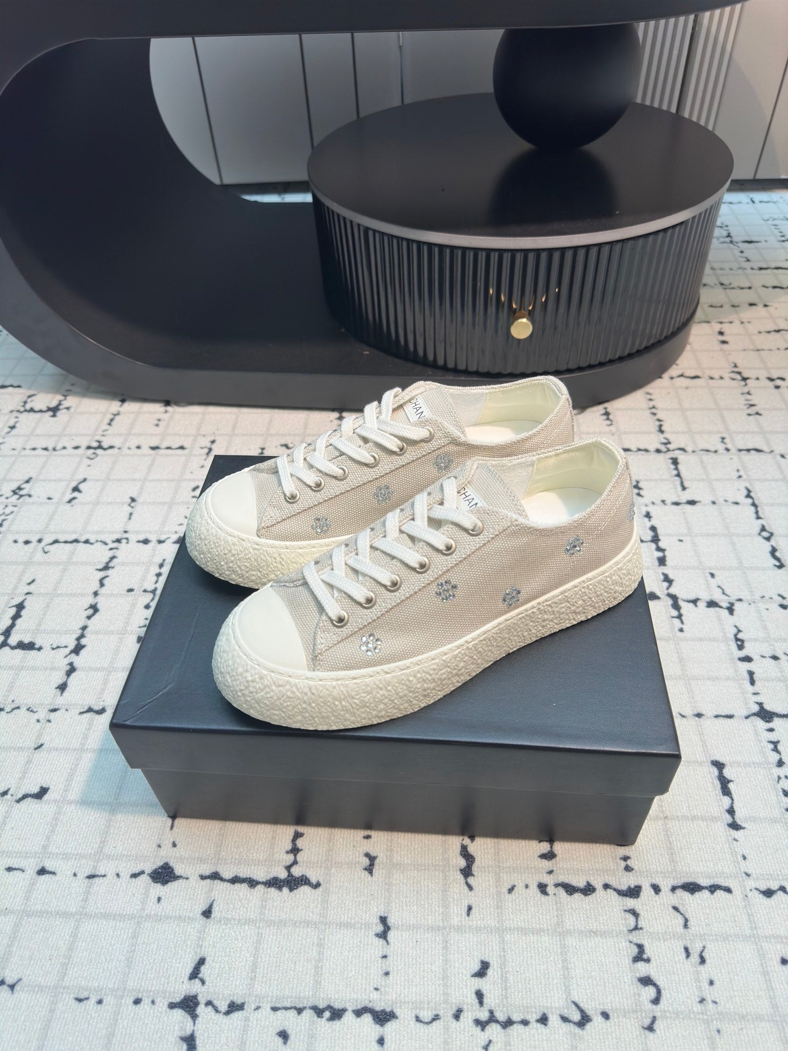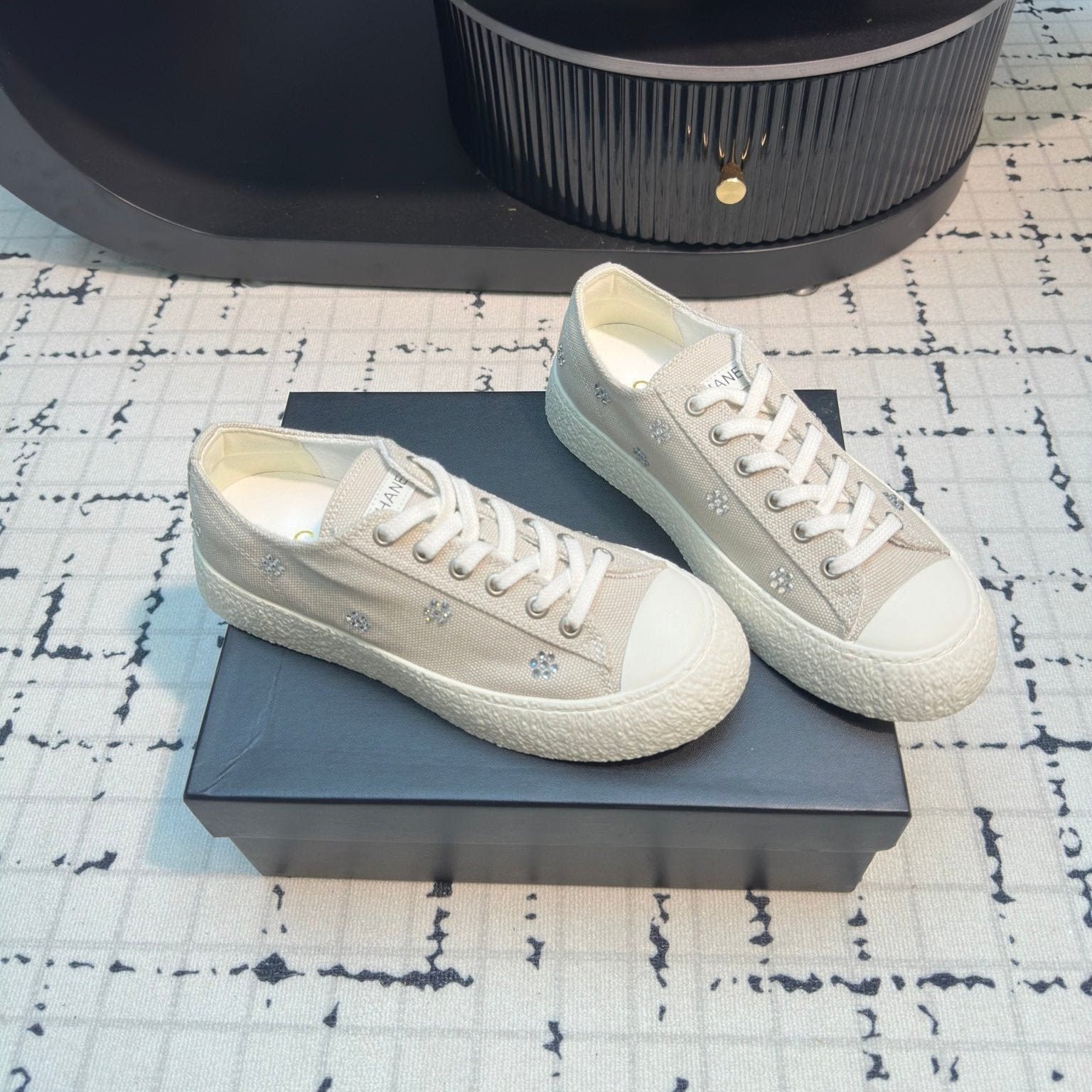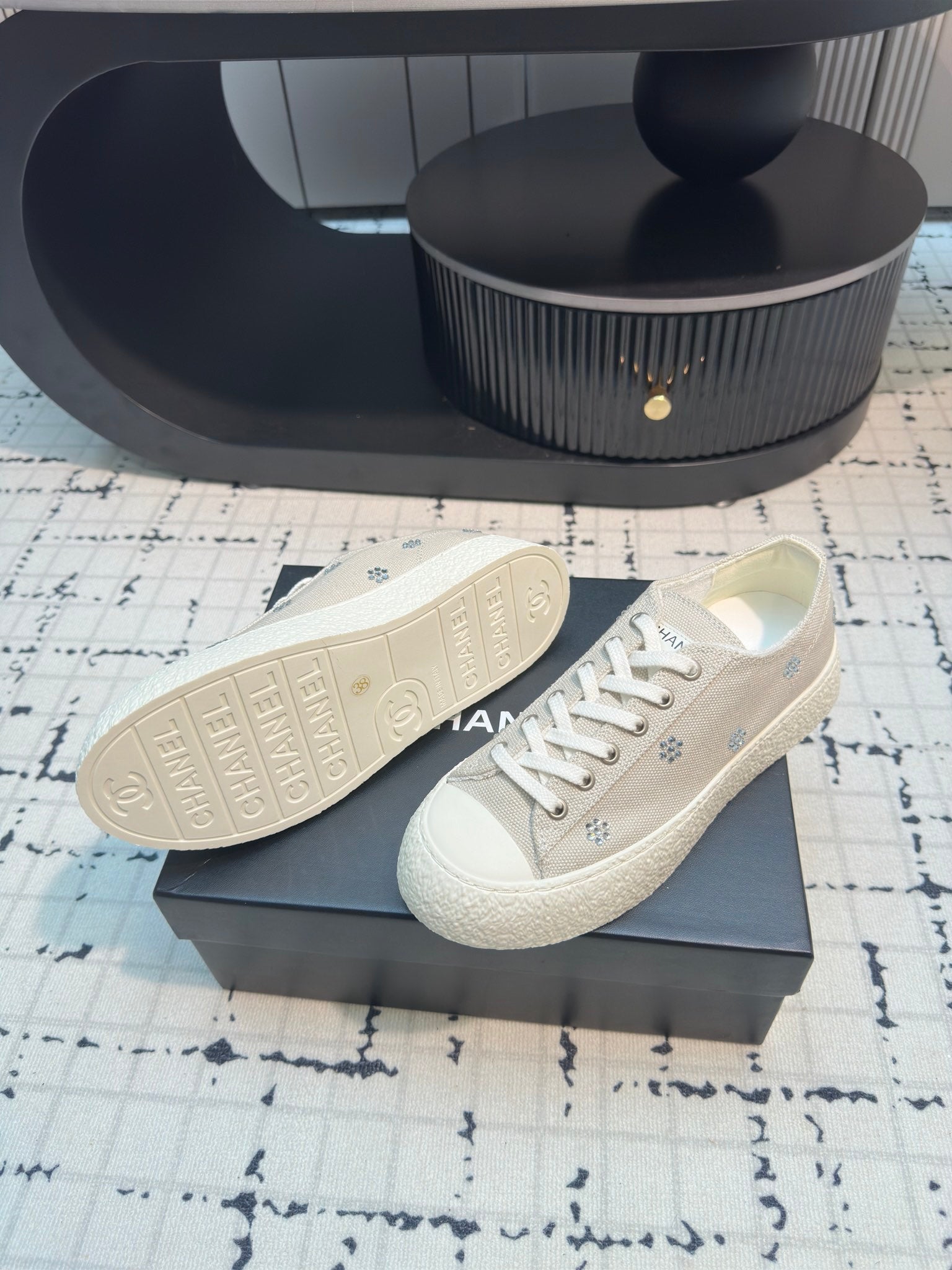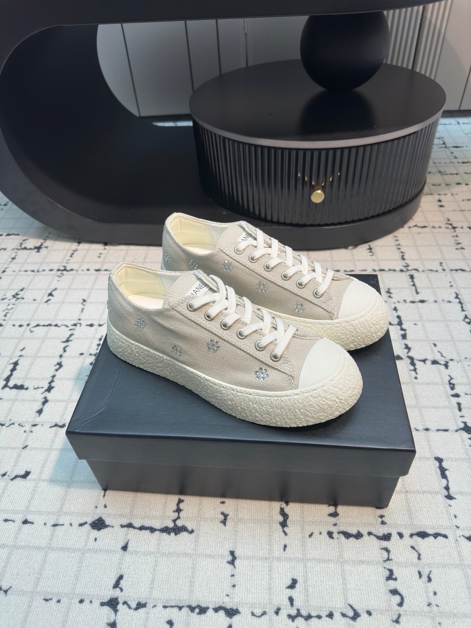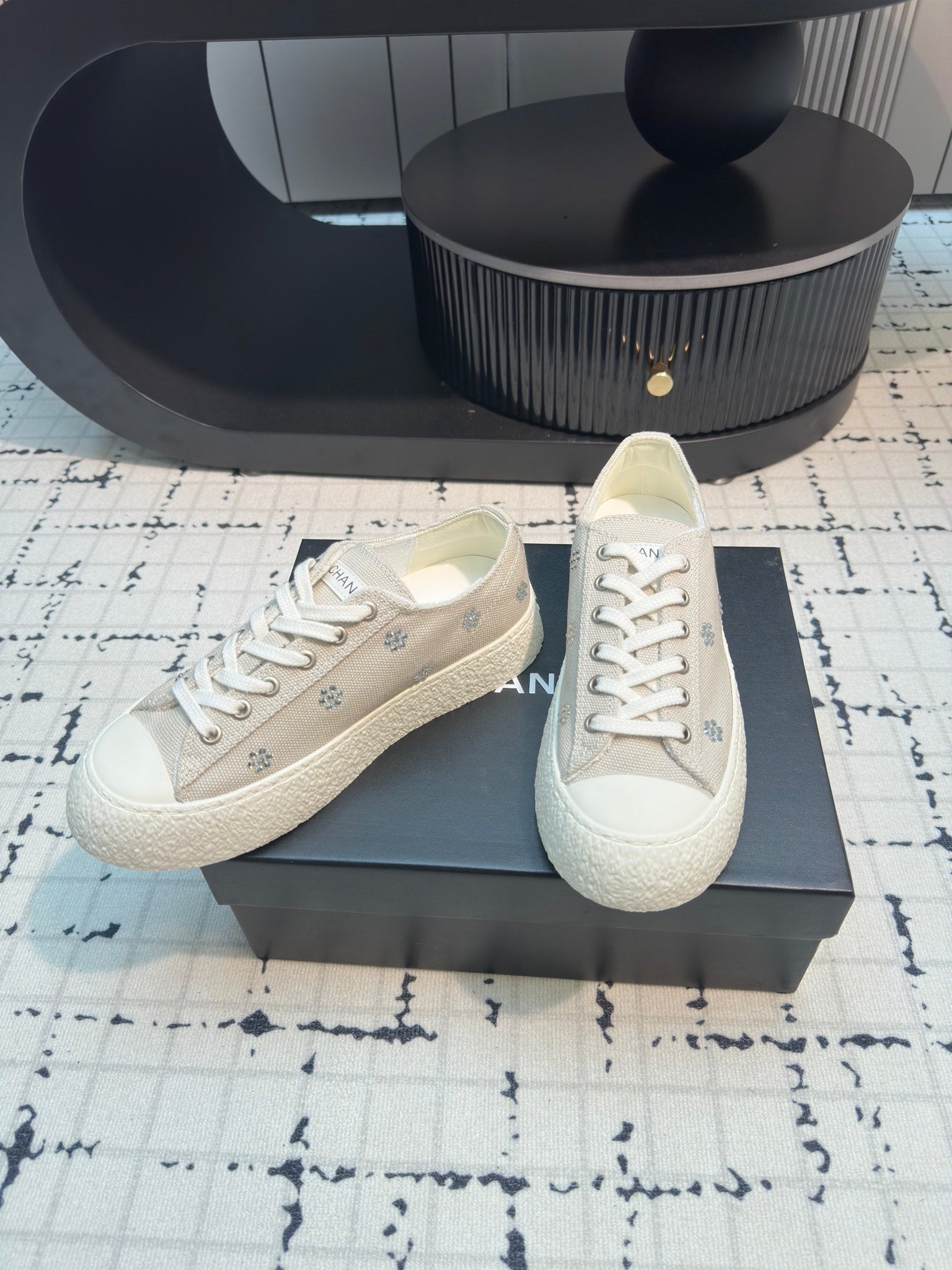 CC Low Sneaker 30mm Light Beige Mix White With Small Flowers Cavas Fabric