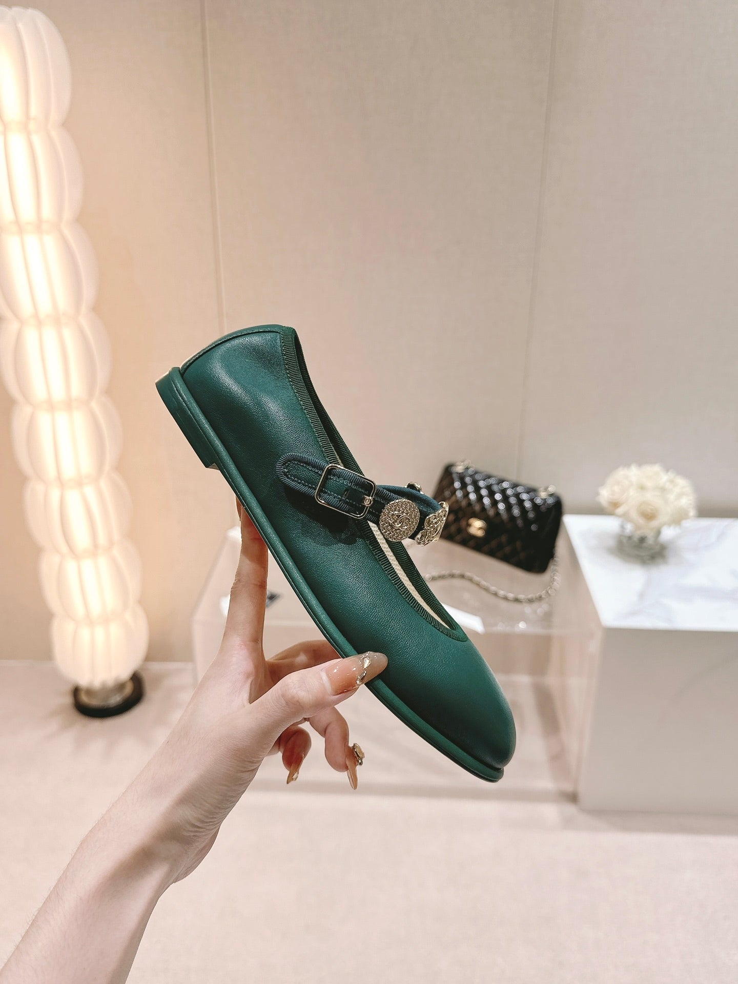 CC MARY JANES GREEN CALFSKIN LIGHT GOLD METALIC