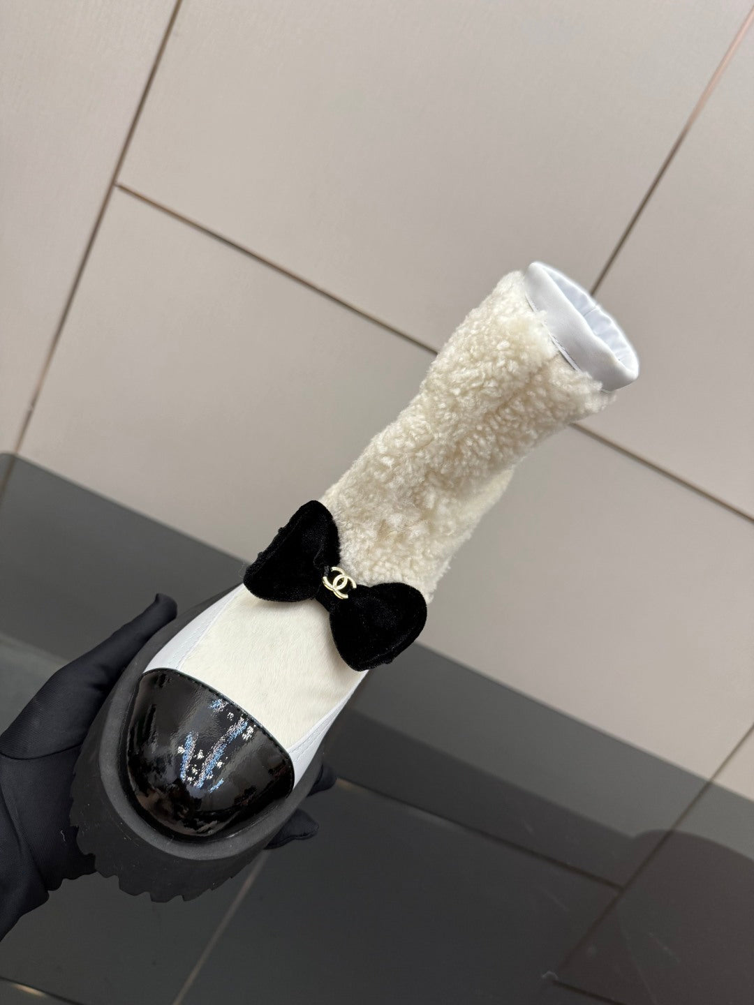 CC platform snow boots white black sheepskin and wool 532187