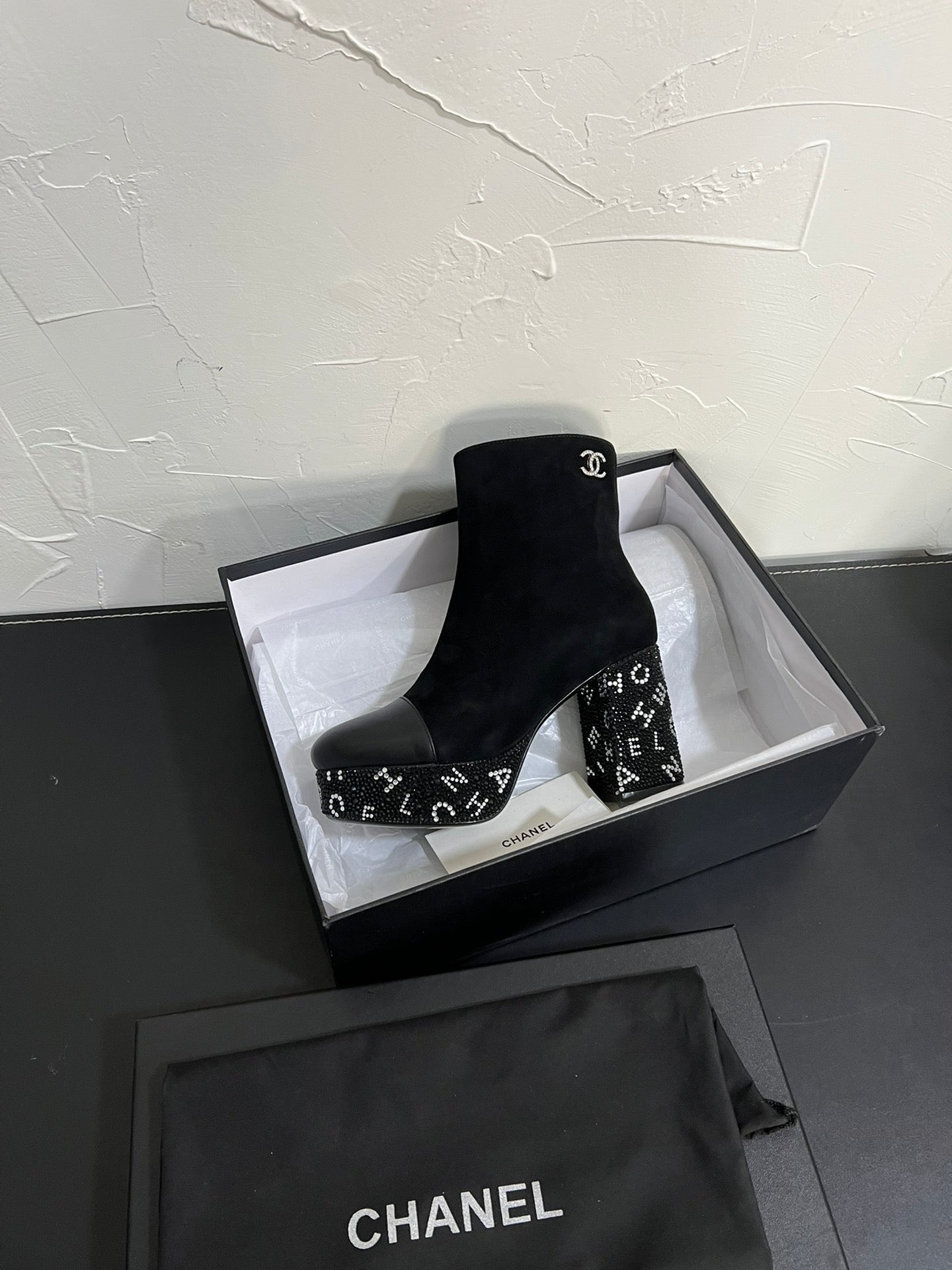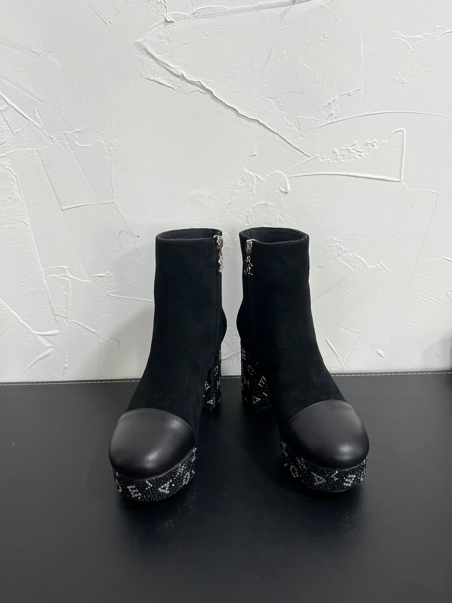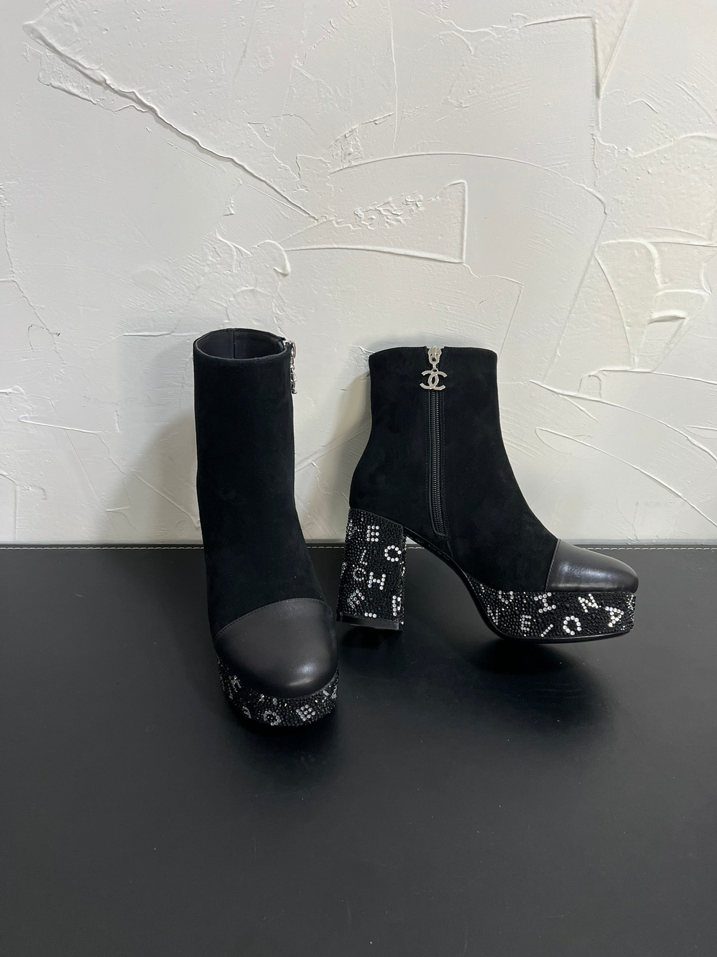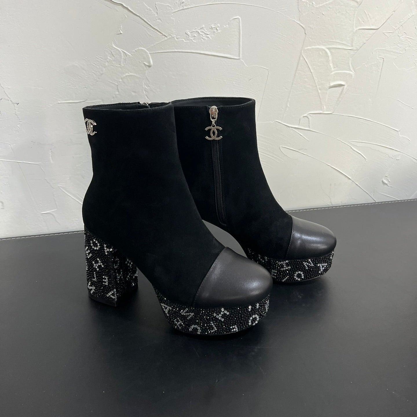 CC Short Boots 95mm In Black With Letters Printed Suede And Lambskin 949659