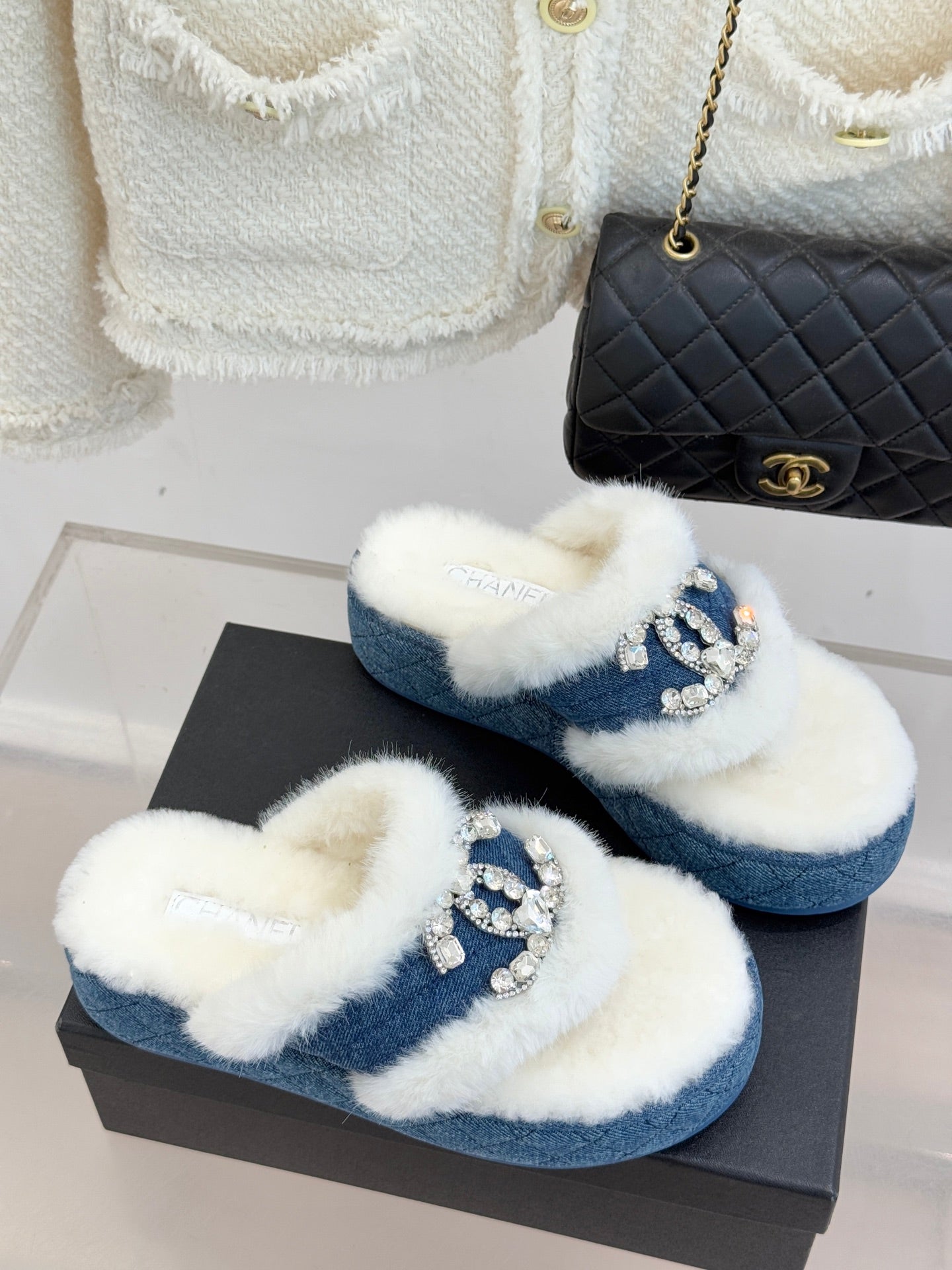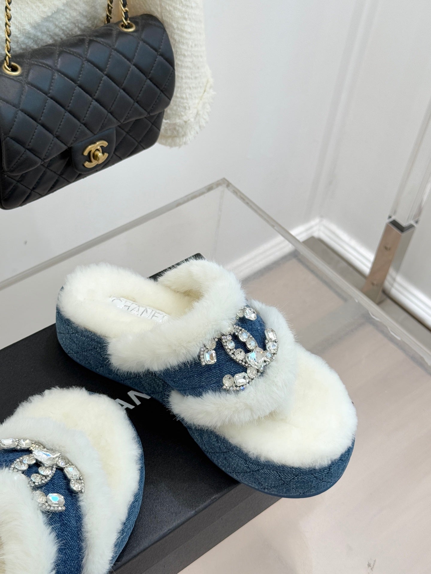 CC slipper double C rhinestone buckle white blue wool 512053