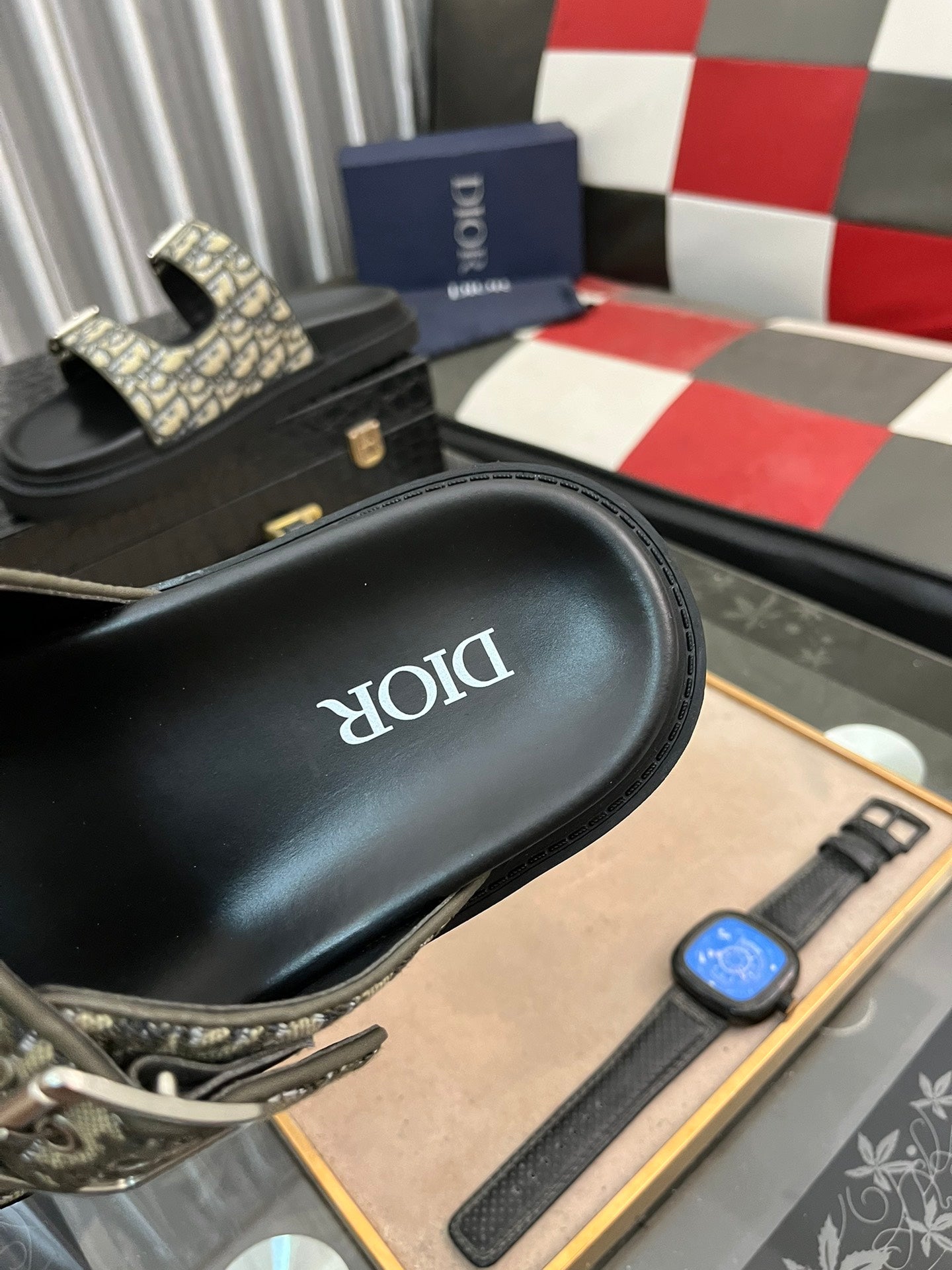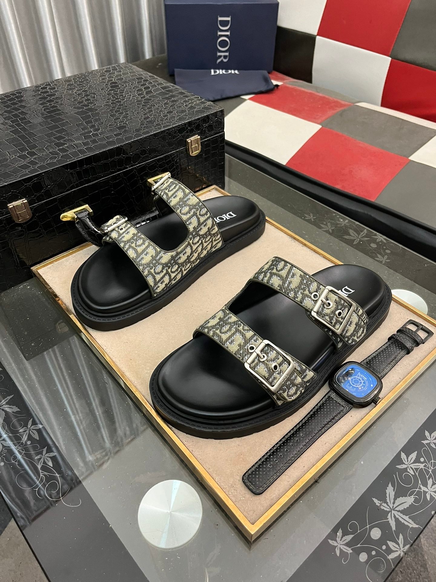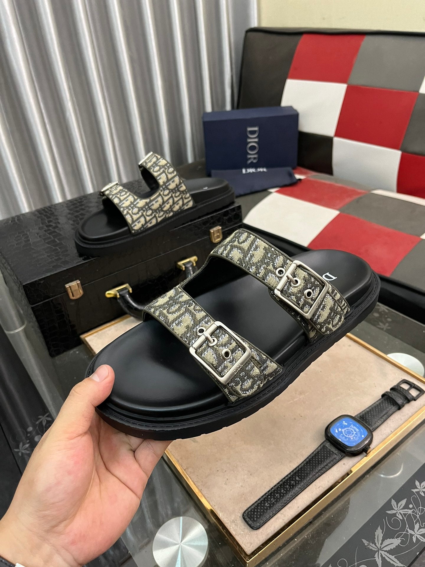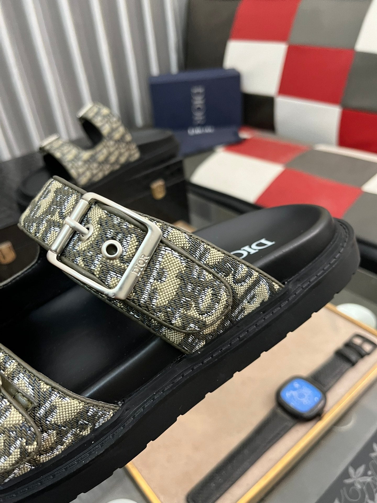 CD AQUA BUCKLE SANDAL BLACK AND SAGE JACQUARD
