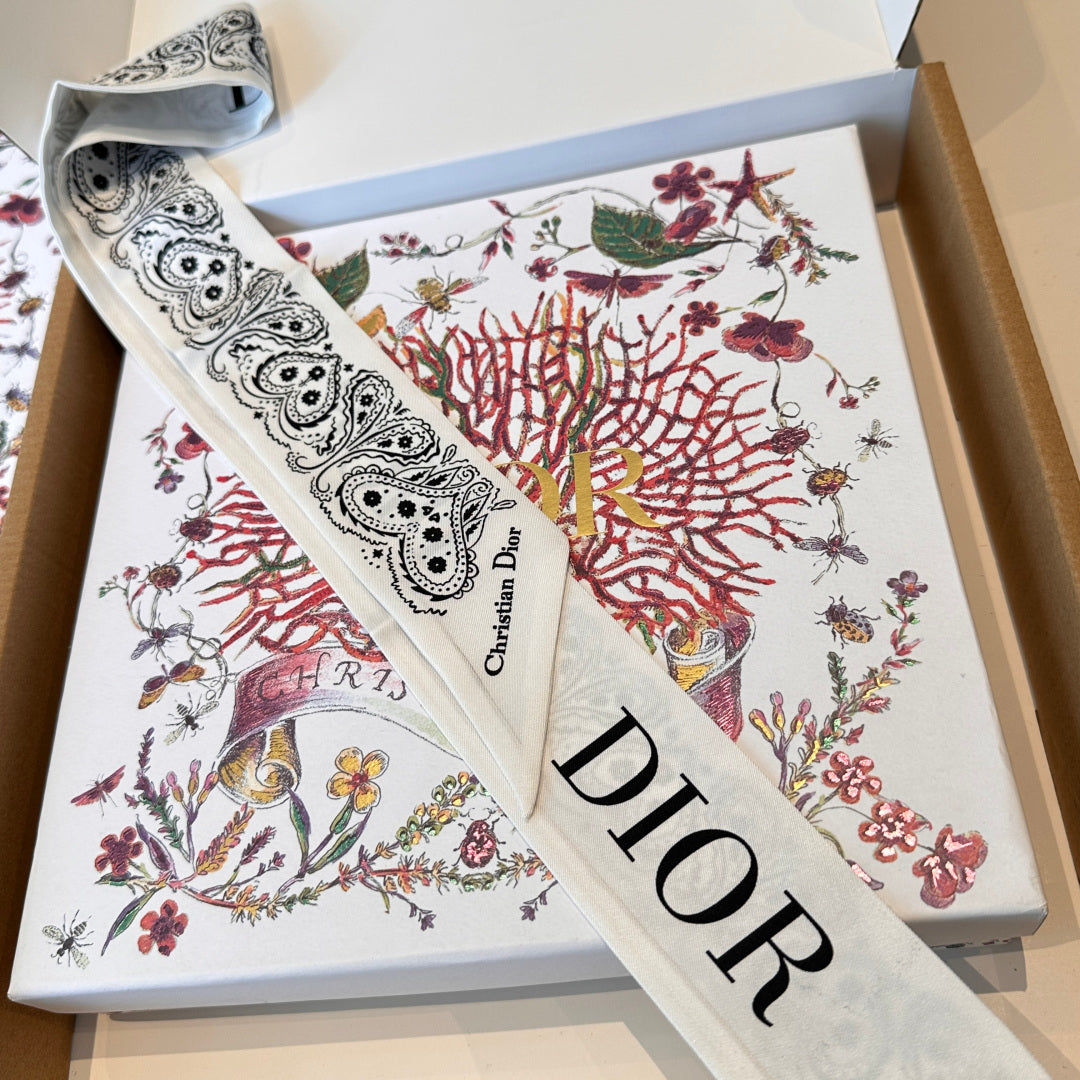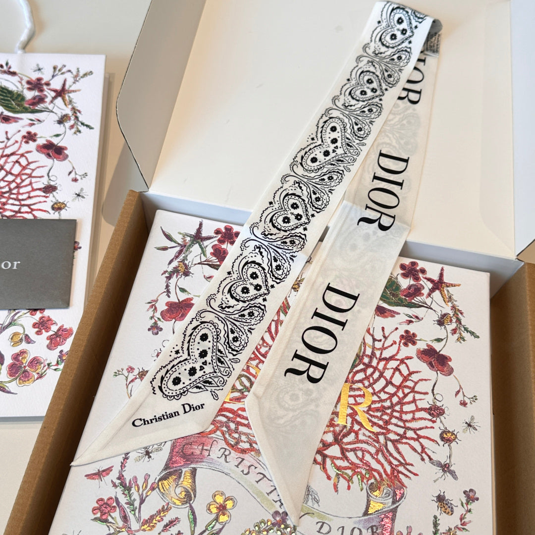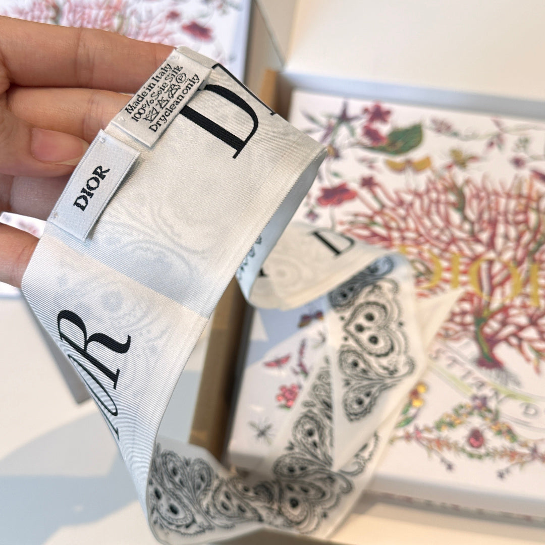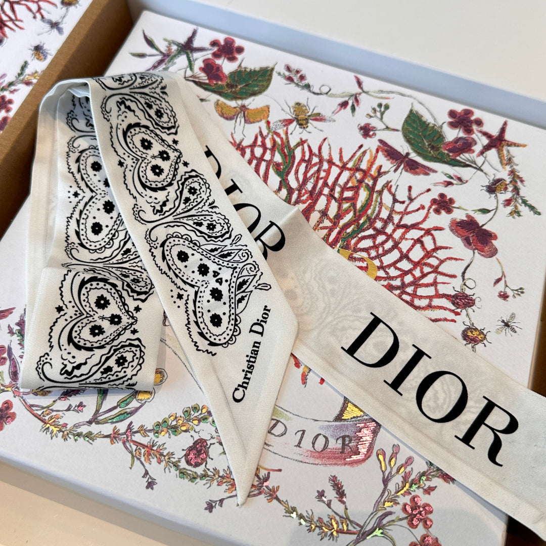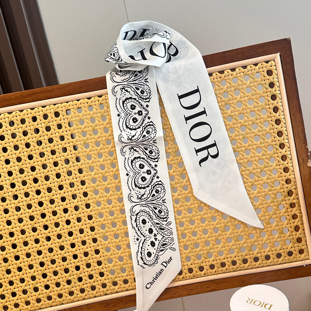 CD Twilly Mini Scarf 105cm White Black Mulberry Silk 968857