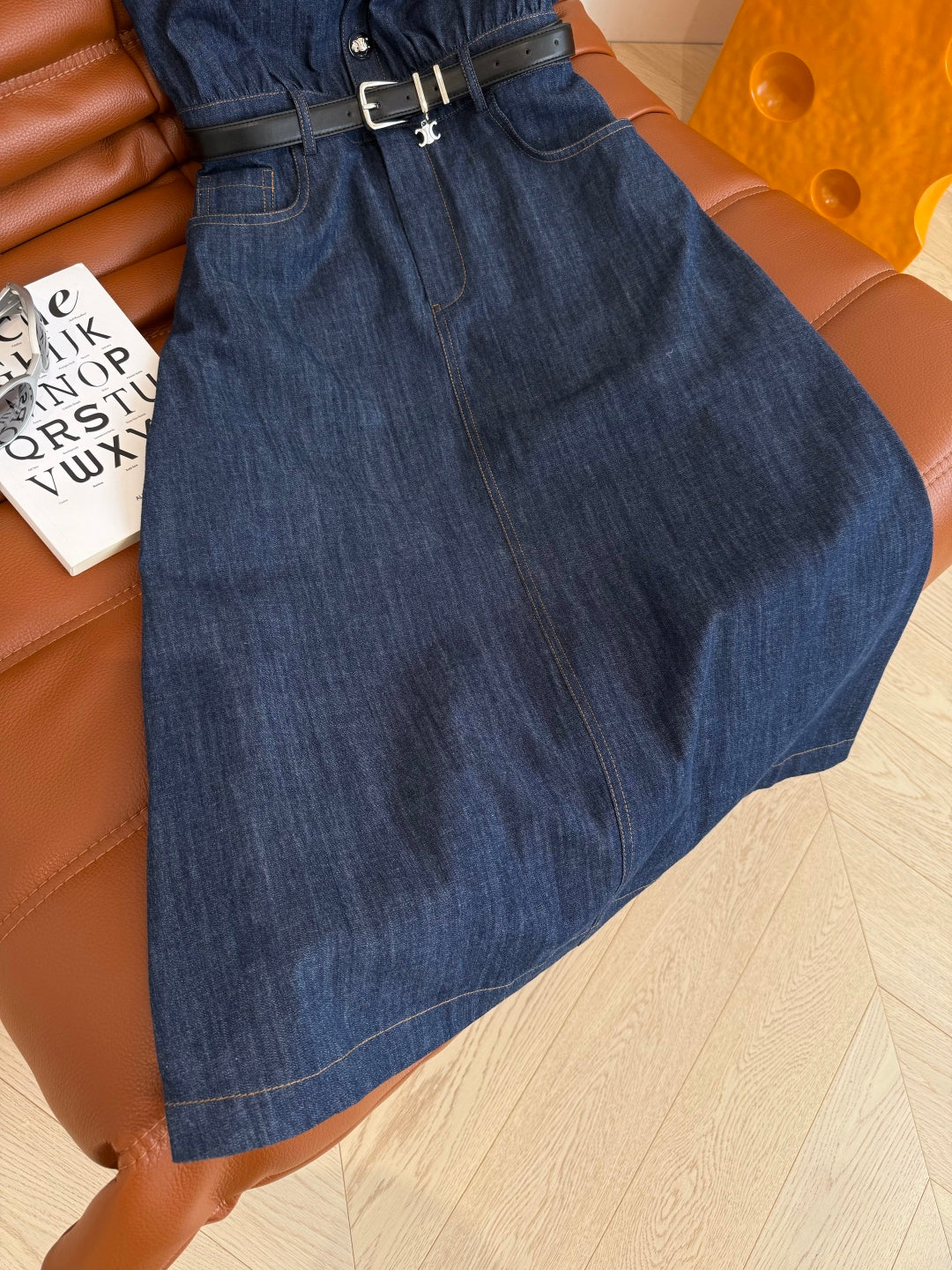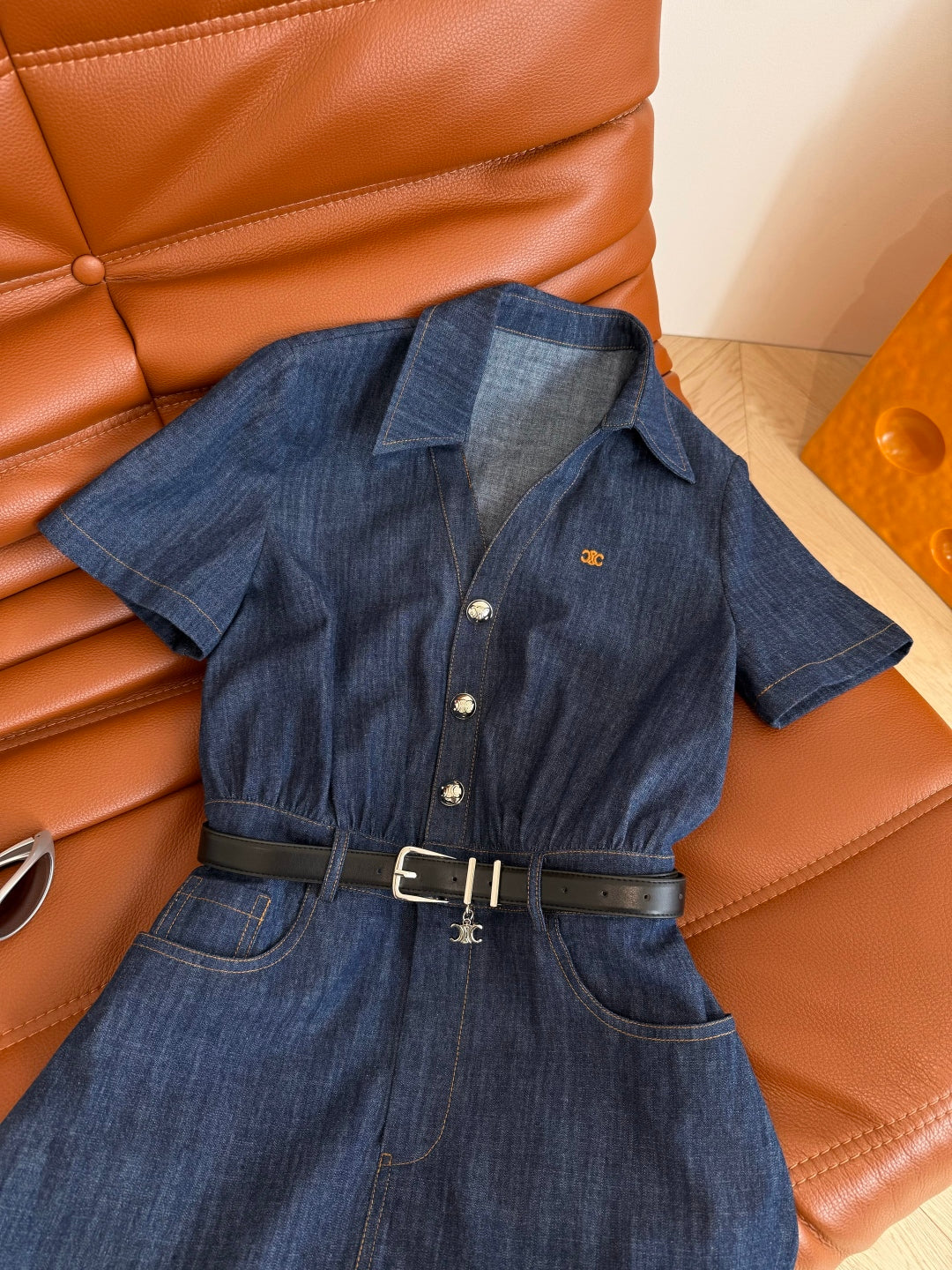 Celine 25 Arc de Triomphe Logo Embroidered Denim Dress Blue Cotton