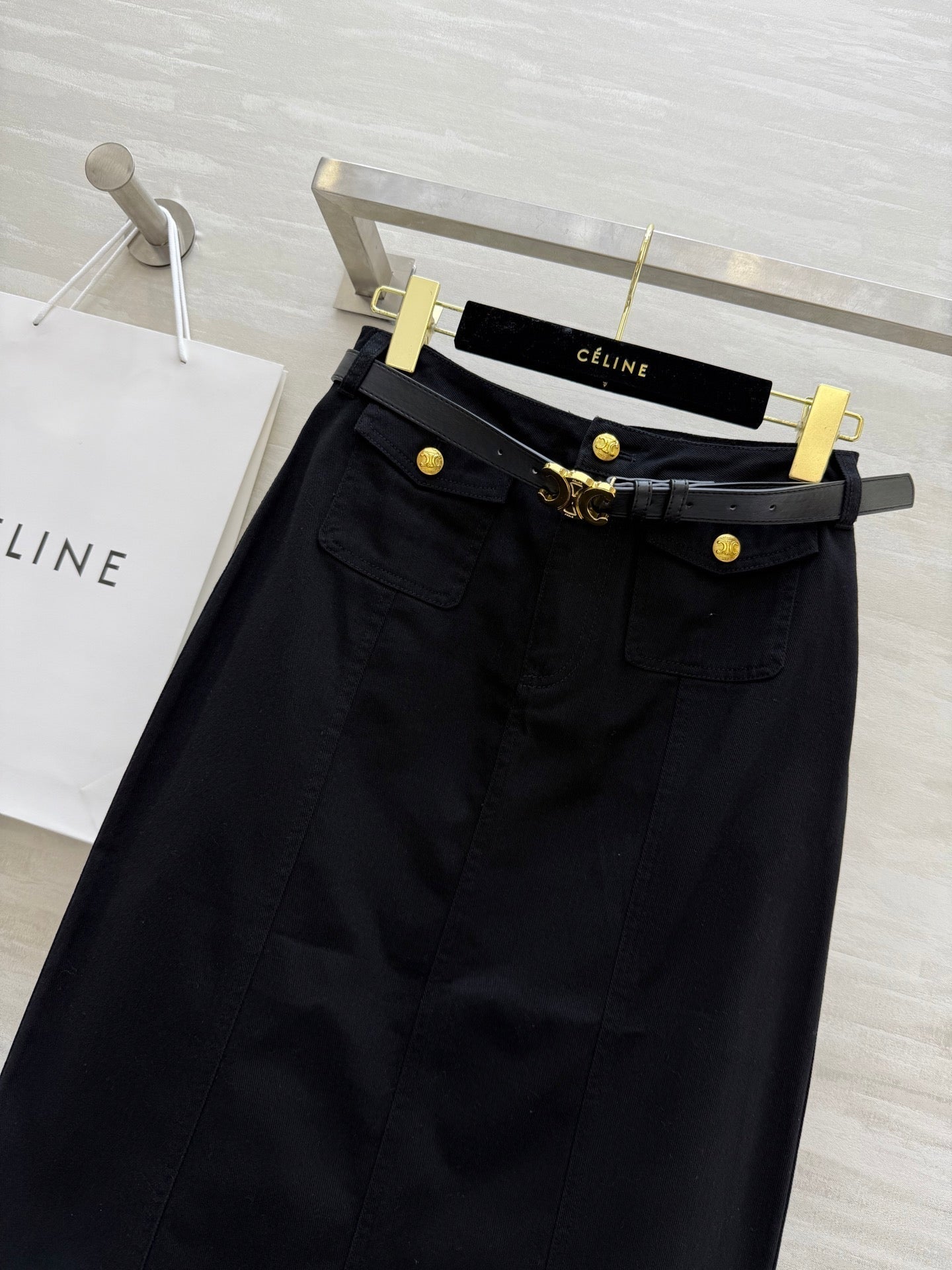Celine 25 Denim Skirt with Logo Belt Black Cotton